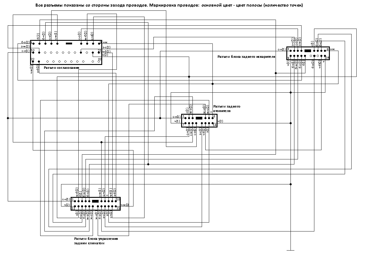 И еще раз здравствуйте. Старую схему удалил, так как были обнаружены в ней небольшие неточности. В частности не предполагал, что в блоках перемычек одна перемычка может группировать не все пины, а несколько групп. Обновленную схему прилагаю. Также готова схемка косы, идущей на задней климат.