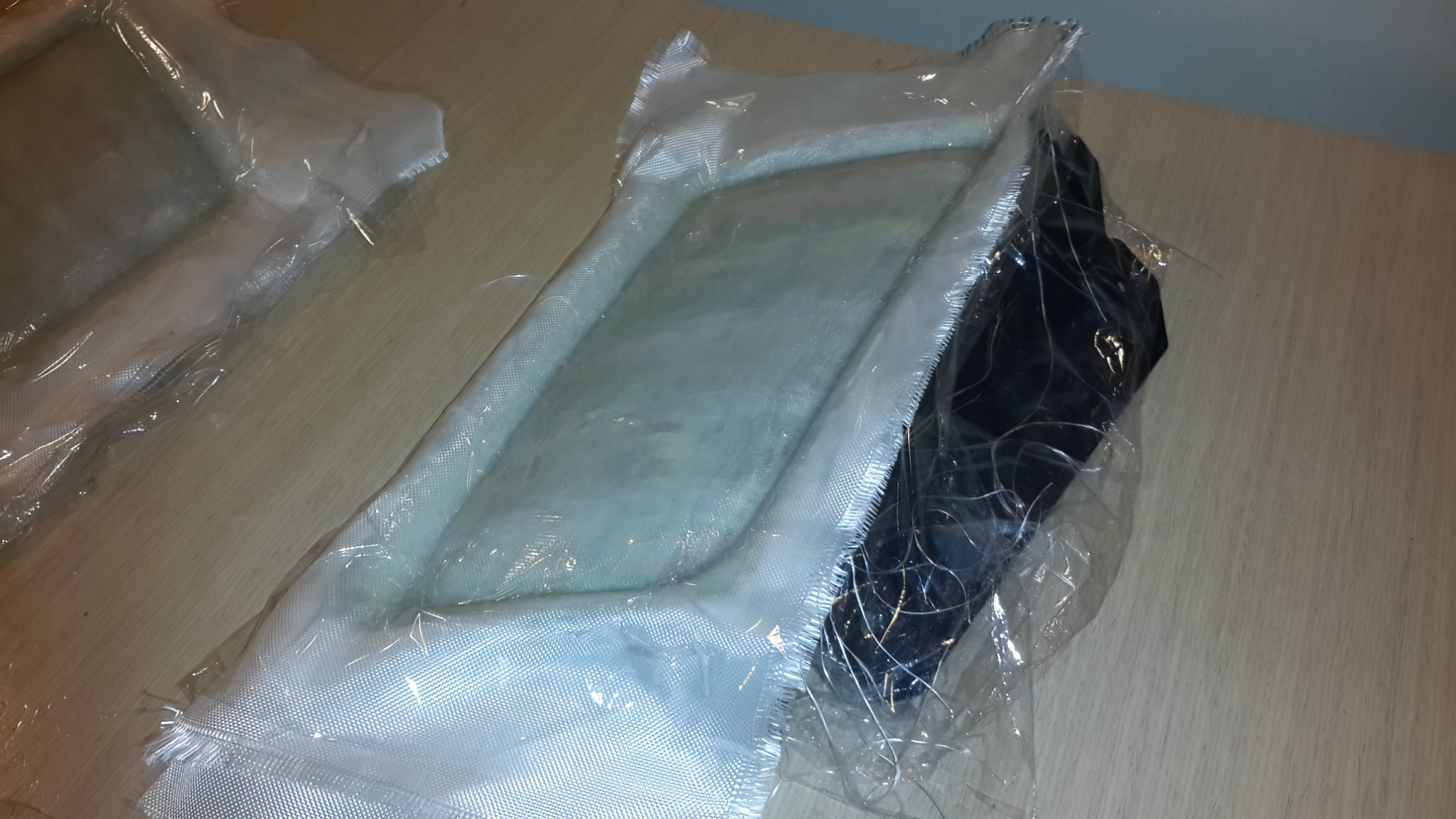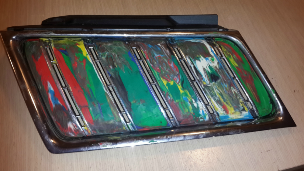 Что бы назиму не вставлять картонку между радиаторами и поуменьшить количество грязи за решёткой радиатора появилась идея изготовить накладки на верхнюю решётку радиатора . Снял решётку, залепил пластилином, проложил плёнку, 4 слоя стеклоткани с эпоксидкой. Отсталось обрезать, покрасить, придумать крепёж.