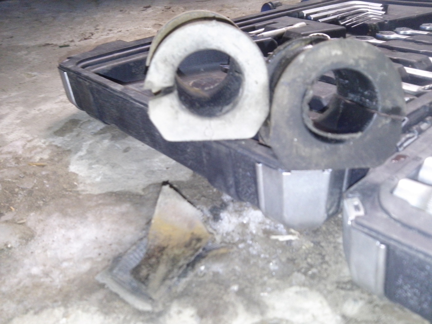 1. Скидываем защиту, откручиваем 2 уха, крепящих стаб и любую из понравившихся гаек (или к которой проще подлезть) на любом из яиц (стойках стабилизатора), снимаем ограничительное колечко на стабе со стороны открученного яйца, получаем стаб, закрепленный всего с одной стороны! 2. Оцениваем степень изношенности стаба и убитости оригинальных втулок. В моем случае одна втулка была насмерть - внутренний корд выдран и смещен из-под втулки в сторону, диаметр втулки разбит на пару миллиметров точно. Вторая втулка почти такая же, только корд не вылез из под втулки. 3. Подготавливаем комплект замены. Решил поставить себе полиуретан, уже пользовался, ничего плохого не могу про него сказать (не реклама).
