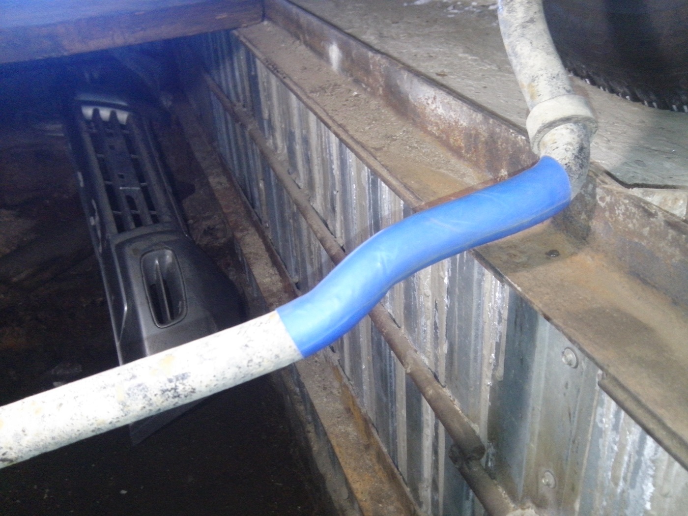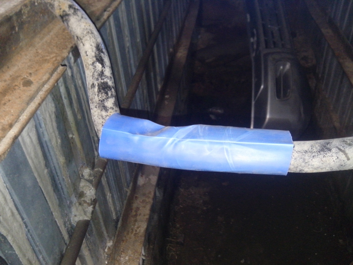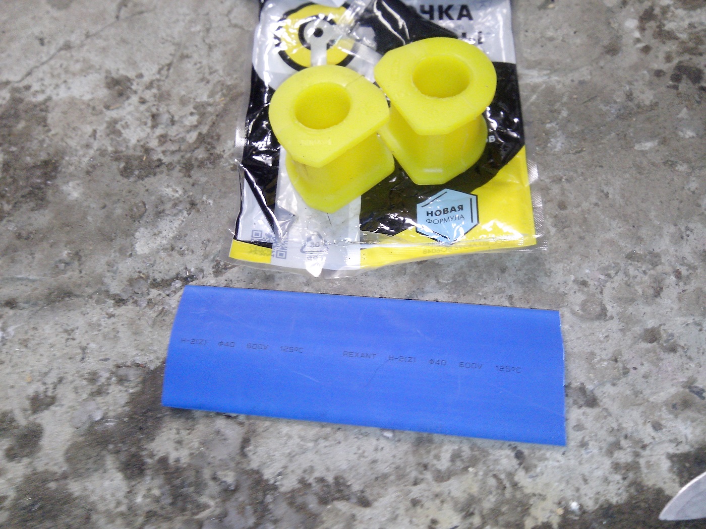 Теперь главное! Под втулку решено усадить термоусадочную муфту (в моем случае синего цвета 40х20), ибо стаб в местах трения подизношен и выберется зазор, а так же поверхность стаба в месте контакта становится гладкой как попка у девочки, вместе с этим муфта, грамотно усаженная сидит мертво и не колышится! 4. Надеваем поочередно, начиная с дальней, муфты, предварительно почистив весь стаб (чтоб при протаскивании до места усадки грязь не осталась под муфтой) и особо тщательно в месте усадки муфты. Муфту греем от середины строительным мощным феном аккуратно, стараясь не расплавить совсем и усаживаем муфту на стаб равномерно без складочек и пузырей. 5. Дальше процедура повторяется с другой стороны, одеваются втулки (обязательно место контакта втулки и стаба с муфтой смазывается специальной смазкой, у меня была в комплекте) и собирается все на место в обратном порядке! Вот так это выглядит в конце концов! Извинюсь сразу, фоткал на пассатижи, больше ничо не было под рукой.