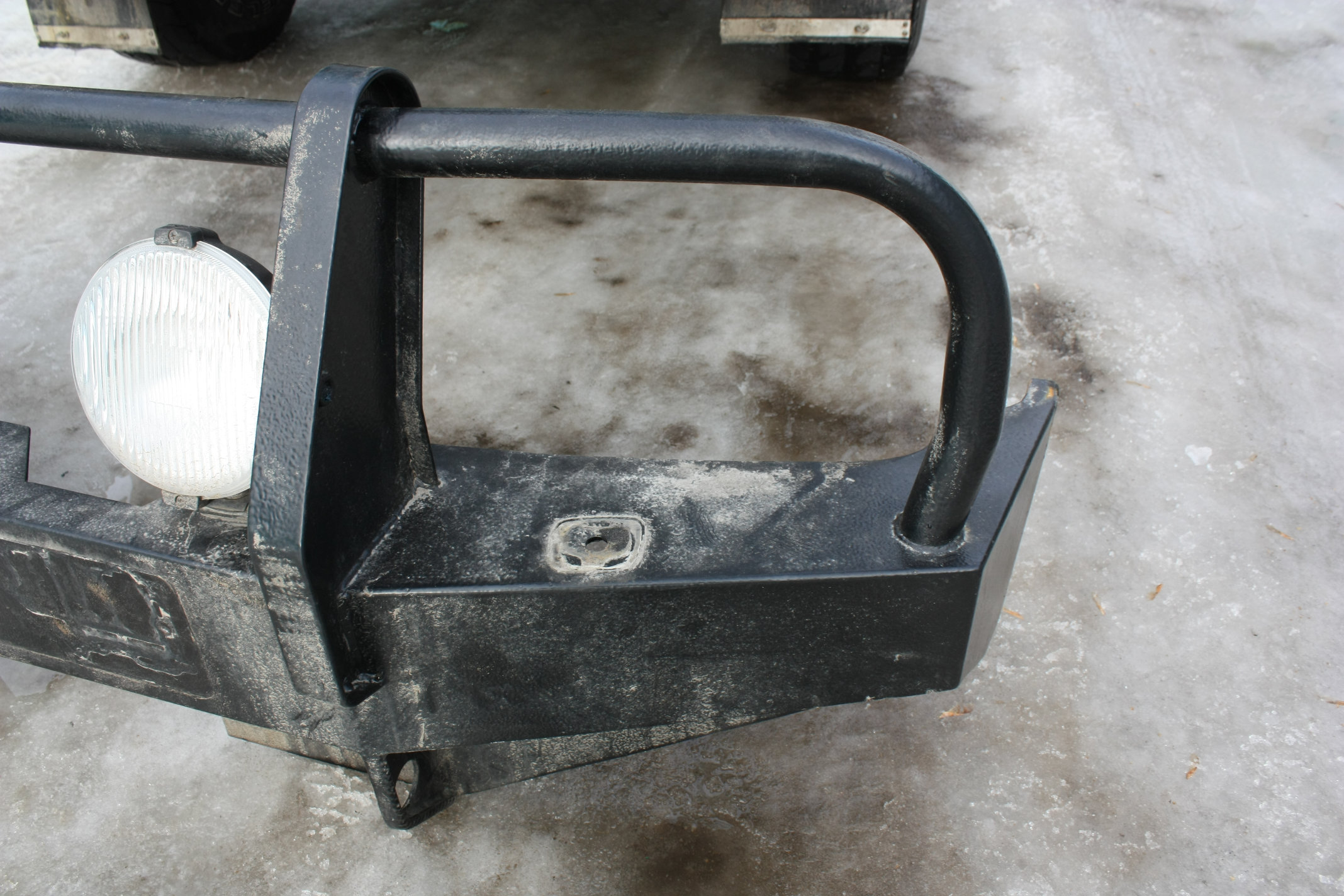 Есть отверстием под трос лебедки, отверстием сверху для контролирования/обслуживания лебедки, упоры под реечный домкрат, съемные штыри для намотки троса лебедки.