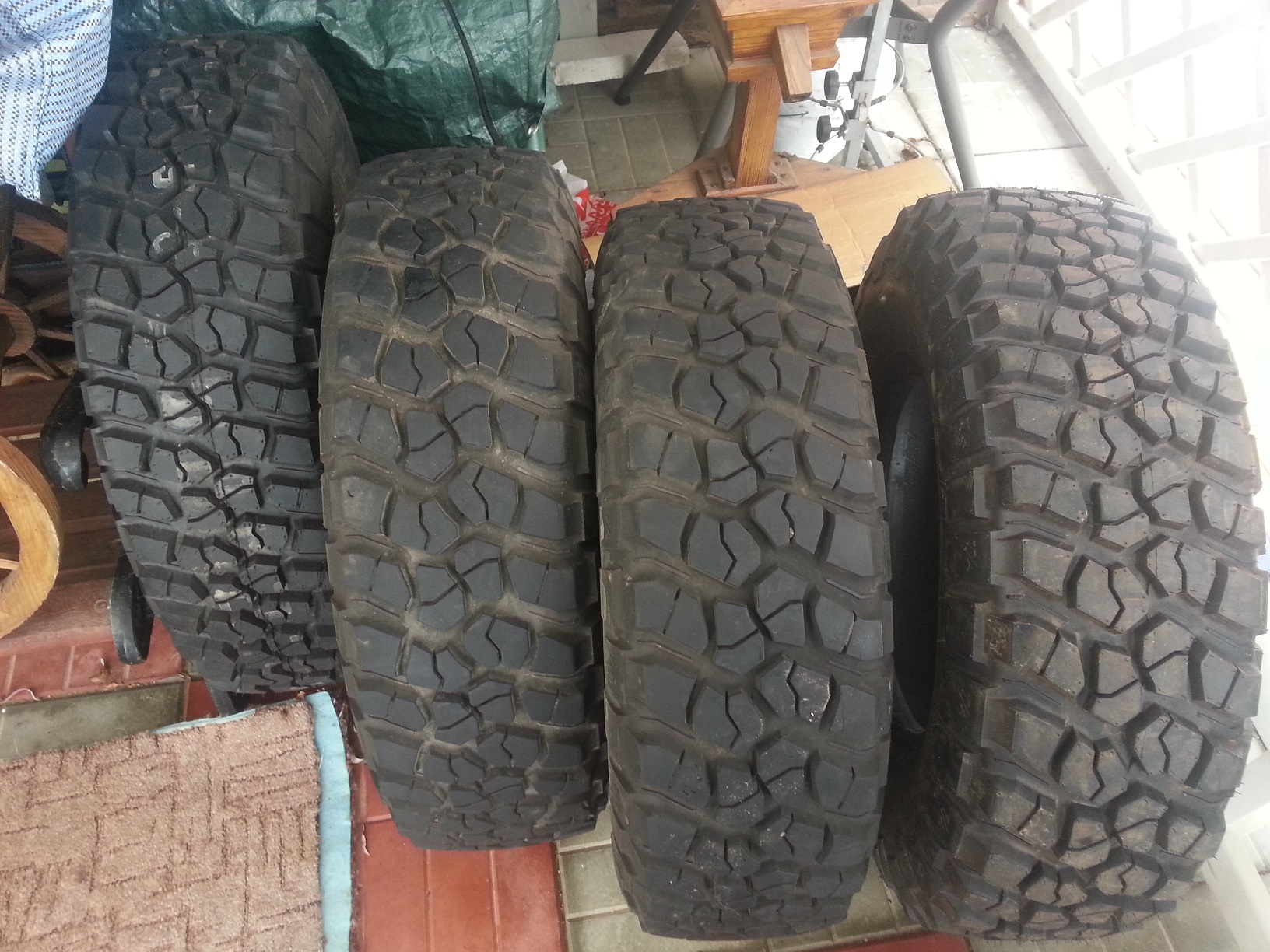 Есть на продажу комплект BFGoodrich MT KM2 265 75 R16. Два баллона абсолютно новые, без пробега, еще два с пробегом примерно 15-20 т.км с равномерным износом и без единого прокола.