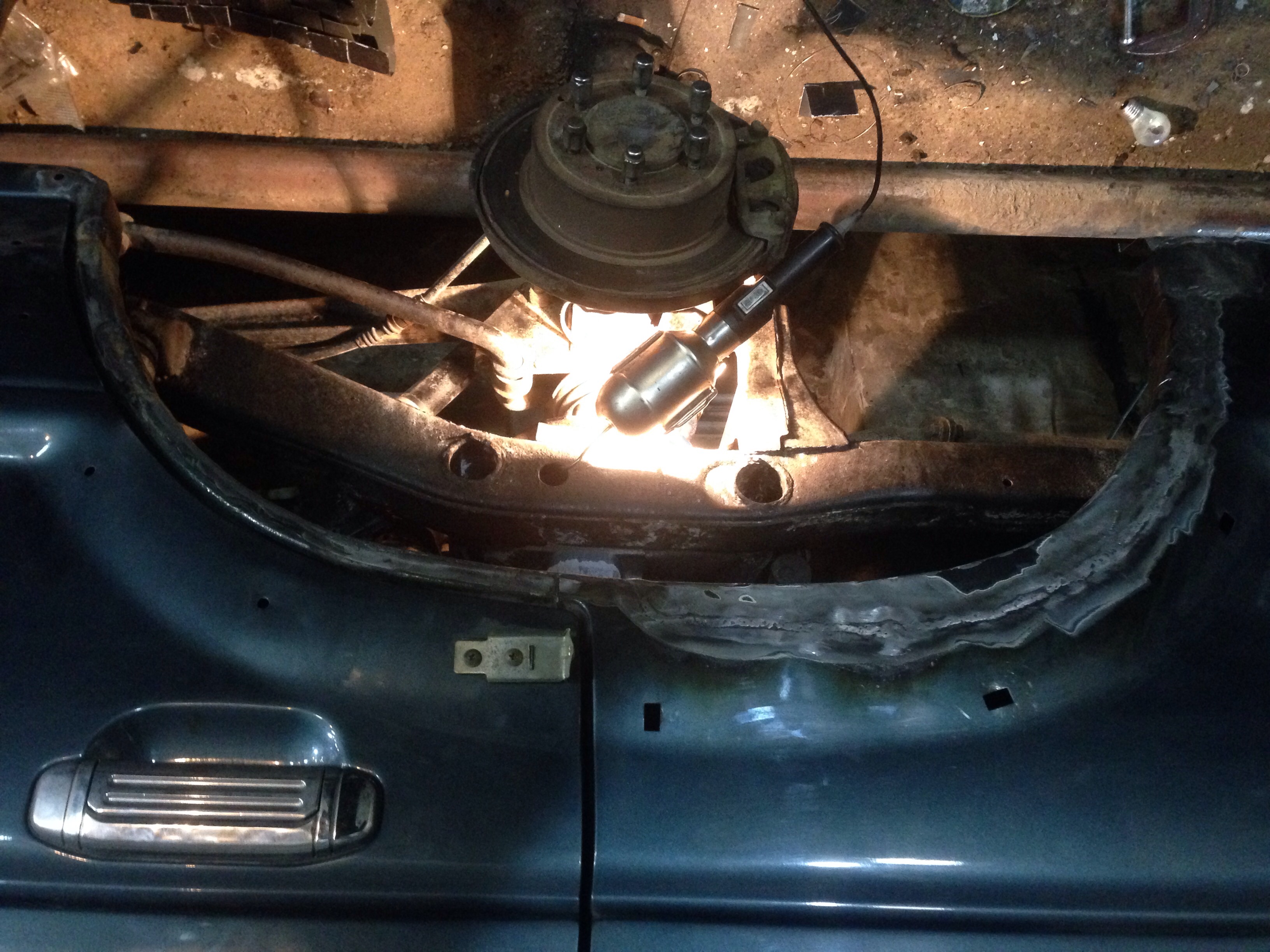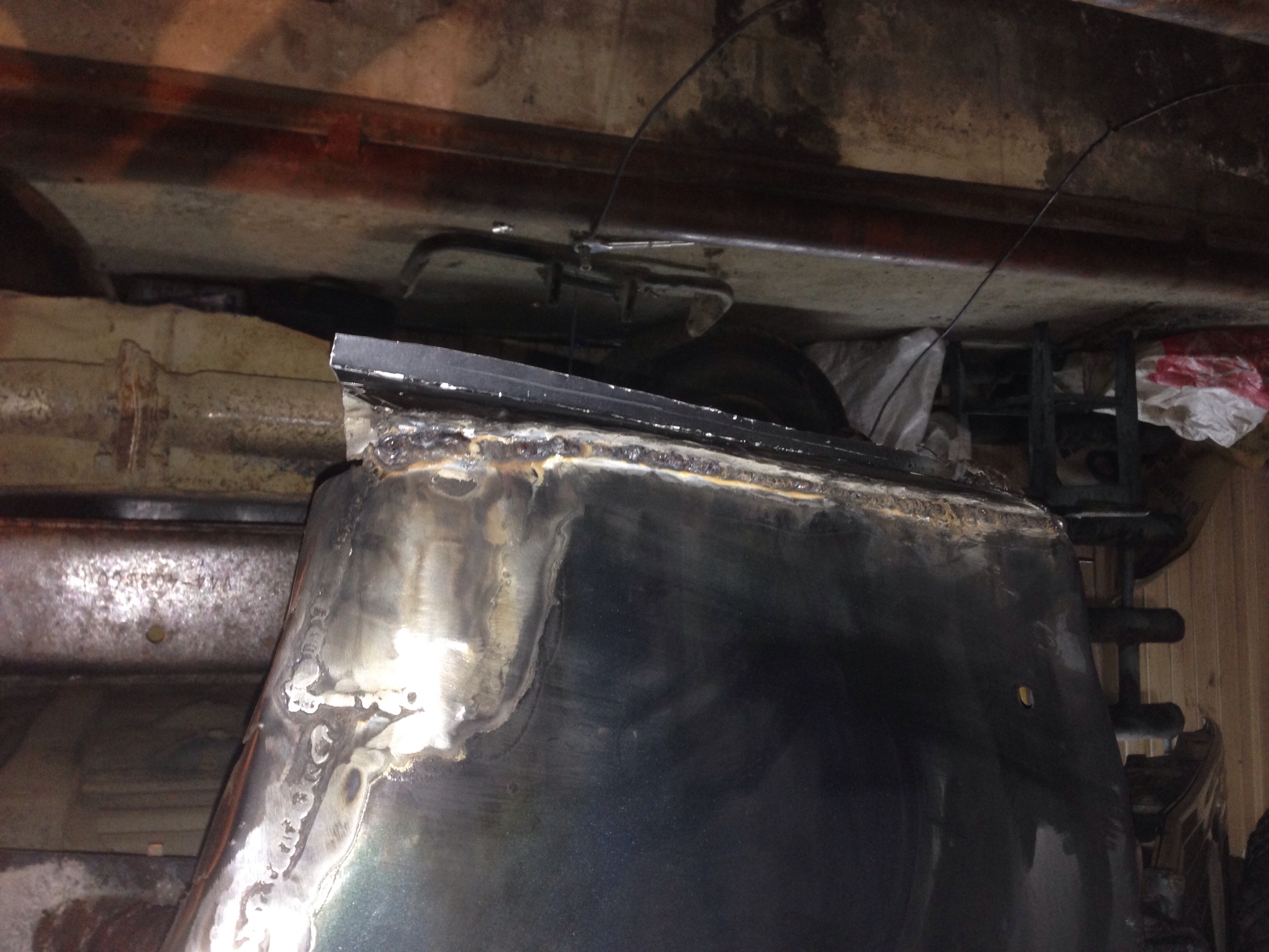 . За эти 5 месяцев было сделано многое: перебрал передний мост, кпп, раздатку, люк, рулевой редуктор, печку, подвеску,салон, поменял ремни ГРМ с роликами, поставил рулевой демпфер, шноркель, промыл радиатор, починил кучу по электрике... Короче, много всего. Но все это меркнет перед кузовными работами. Я не кузовщик, хотя работаю на СТО, занимаюсь дизелями, поэтому при ремонте кузова был в состоянии близком к предынфарктному. Я писал уже по поводу небольших дыр в задних арках. Так вот, эти "небольшие дыры" оказались огромными дырищами после мойки и очистки от ржавого металла. Причем правая сторона сгнила сильнее, чем левая. Заднюю правую арку пришлось восстанавливать полностью заново из кусков металла. Там сгнило все, начиная от порога под задней дверью и до заднего свеса (там, где выходят дренажные трубки с люка). Все это было кропотливо восстановлено из кусочков металла. Сварки было очень много. Поначалу просил знакомого, который умеет варить, потом варил сам (научился в процессе ремонта). Вырезал заплаты, шпатлевал и грунтовал самостоятельно. Конечно, результат не идеален, но под пластиком видно не будет, а, главное, надежно и крепко.
