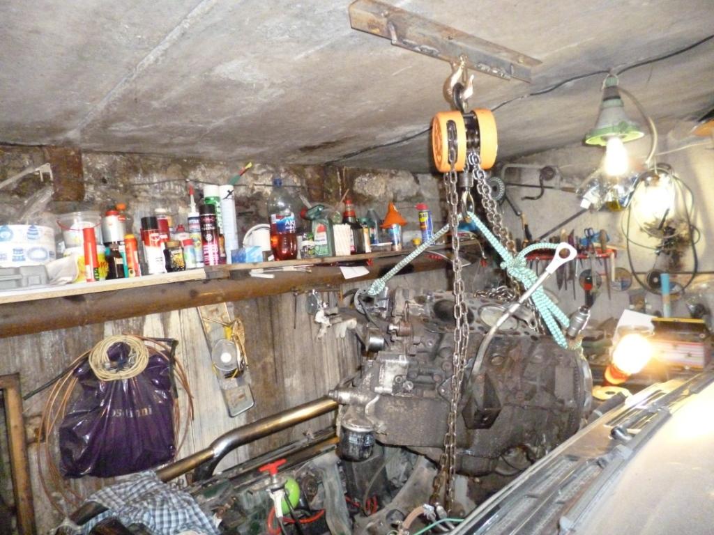 Мотор был вынут при помощи китайской тали грузоподъемность 1 тонна прикрученной к потолку.