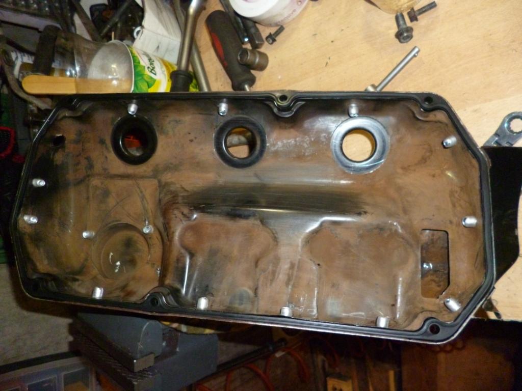 Когда мотор был на месте дело пошло быстрее. Но очень много (около часов 30) пришлось потратить на промывку крышек клапанов. Смысл в чем, на моём моторе сапуны мотора встроены в эти крышки в виде вваренных внутрь крышек еще двух частей которые совместно образуют каналы, уловители масляного тумана. Вся эта конструкция сварена точечной сваркой. За годы эксплуатации в этих каналах накопилось много абразива и как я не пытался его вымыть это не получилось. Было принято решение рассверлить крышки и промыть, а затем собрать их алюминиевыми клепками. Под каждую клёпку закладывался силиконовый герметик, но на всех герметика не хватило. Я понадеялся что клепки будут держать масляный туман и без герметика, но нет, после запуска ДВС была обнаружена течь масла и пришлось одну крышку переклёпывать с герметиком.