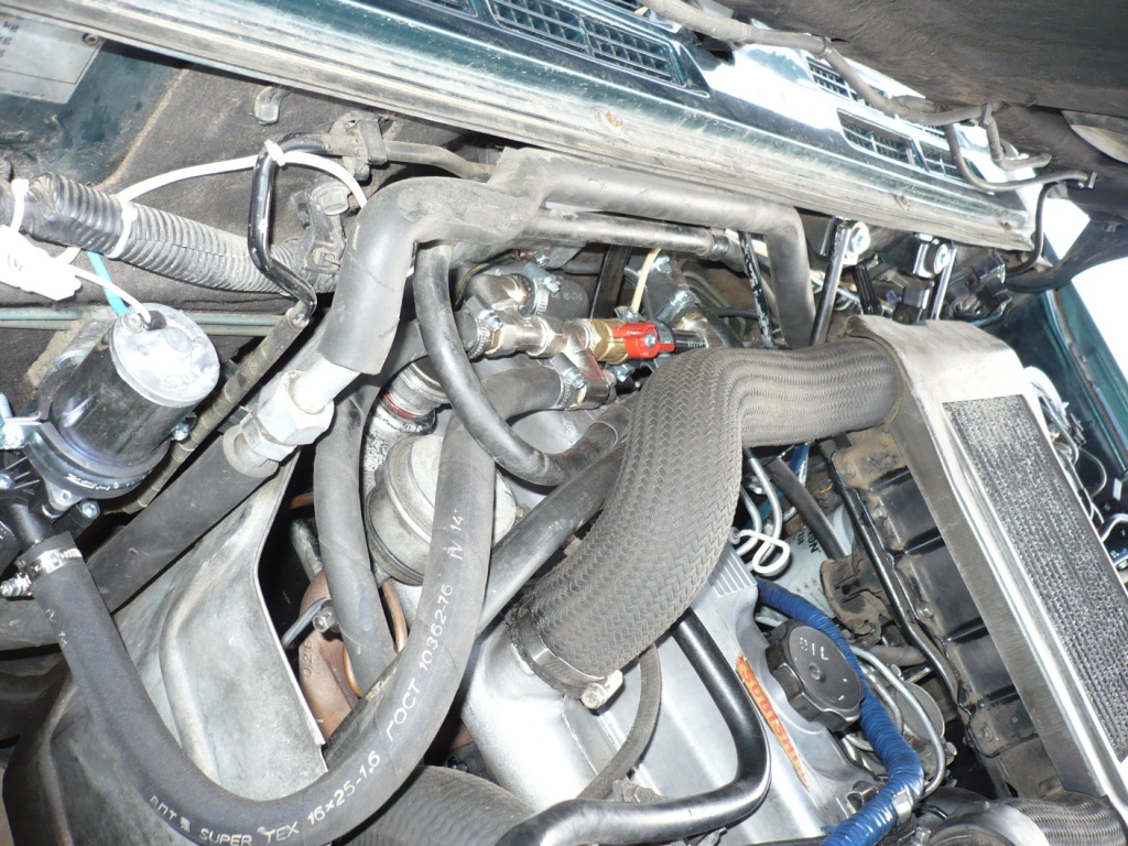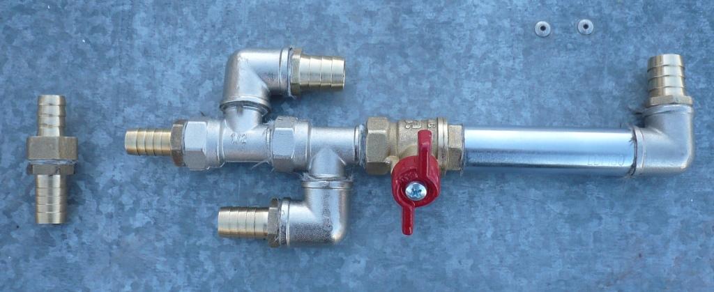 Затем соорудил супер-пупер тосолоразборник. Суть его заключается в том, что когда необходимо подогреть ОЖ, кран перекрывается и циркуляция ОЖ происходит только через двигатель, минуя отопители. При - 10 градусов мороза, только двигатель нагревается до 50-60 градусов за 1 час. Два левых, входящих слева штуцера – с помпы и с турбины, левый выходящий справа штуцер – выход на штуцер в ГБЦ, из которого раньше патрубок шел на отопитель. Ну и выходящий справа штуцер выход на отопитель.