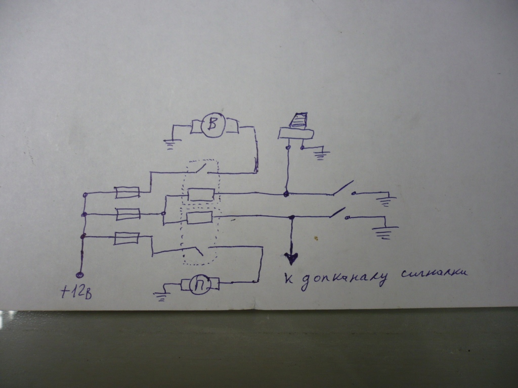 Т.к. на ремонт машины уже изрядно потратился и бюджет заканчивался, пришлось покупать на разборке вентилятор с ВАЗ-2108. Прикинул, он идеально вписывался еще и с зазором около 5 мм. Сделал нехитрые кронштейны из полосы 25 мм, толщиной 4 мм и вент прижился. Разработал схему подключения вентилятора и помпы. Вентилятор включается от датчика и принудительно выключателем, помпа включается принудительно выключателем и дополнительным каналом сигнализации с брелка (я живу в частном доме, вечером кран перекрыл, удлинитель подключил к подогревателю, вилка удлинителя и розетка на расстоянии вытянутой руки , не вставая с кровати… ))) Будильник на час пораньше, вилку в розетку и спать еще час, проснулся – брелок нажал, помпа 30 сек проциркулировала ОЖ). Схема подключения в натуральном виде. ))) Двойной переключатель.