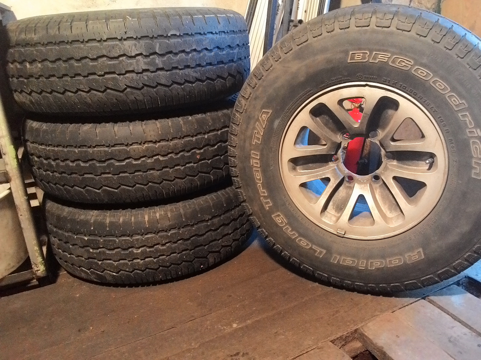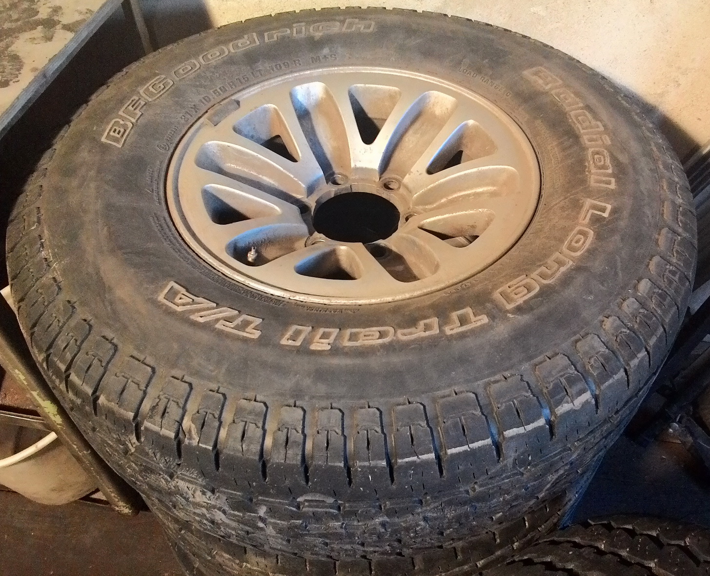 Резина BFGoodrich Radial Long Trail T/A 31x10,50 R15 LT 109 R M+S. Остаток протектора в среднем 5 мм. Разрывов, порезов, грыж и т.п. нет, по окружности износ равномерный, на скорости 120 (больше не езжу) вибраций нет. Есть один жгут от прокола(гвоздиииик