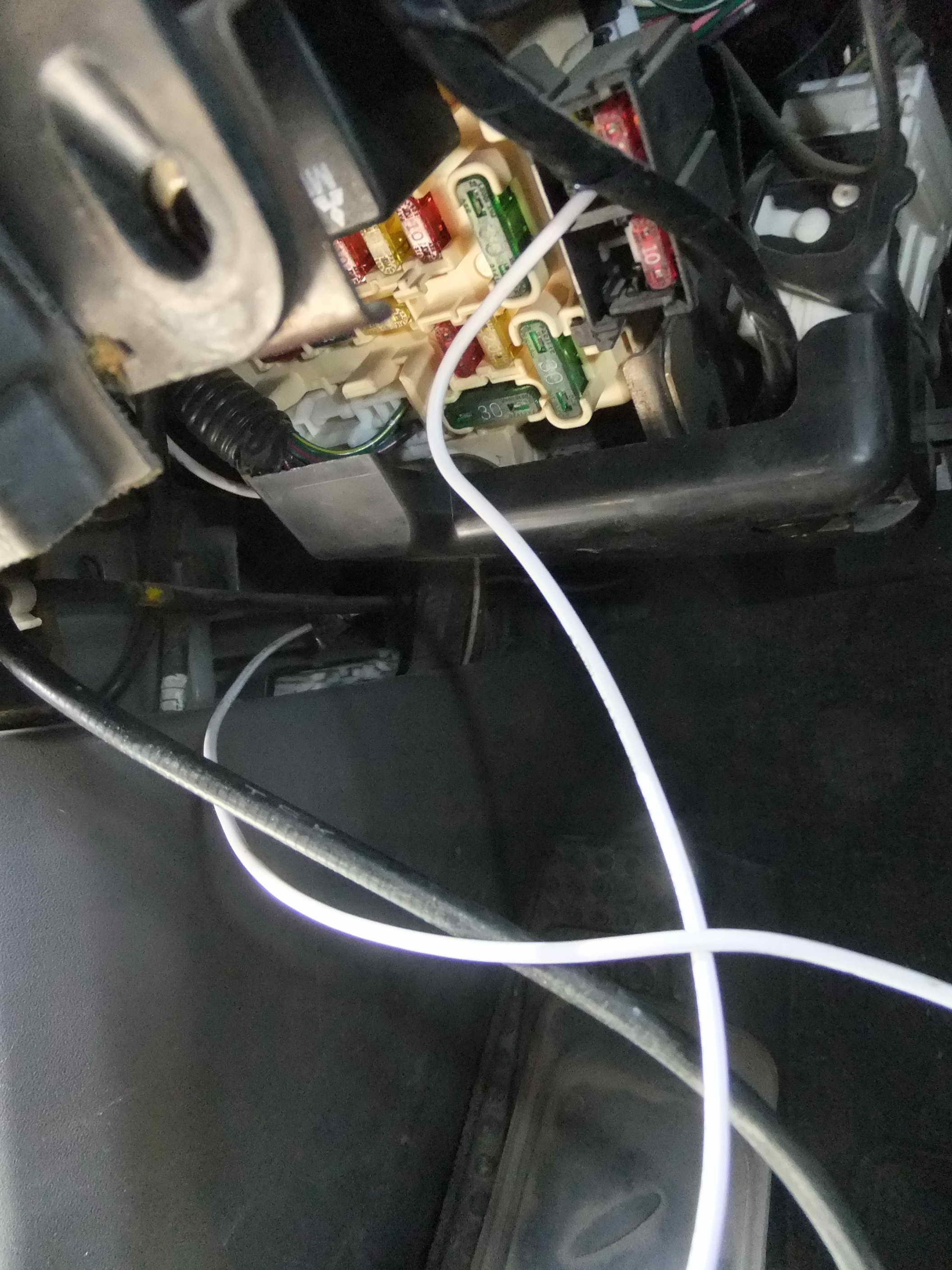 Провод проброшен до отверстия вывода в отсек троса замка капота и введен в салон.