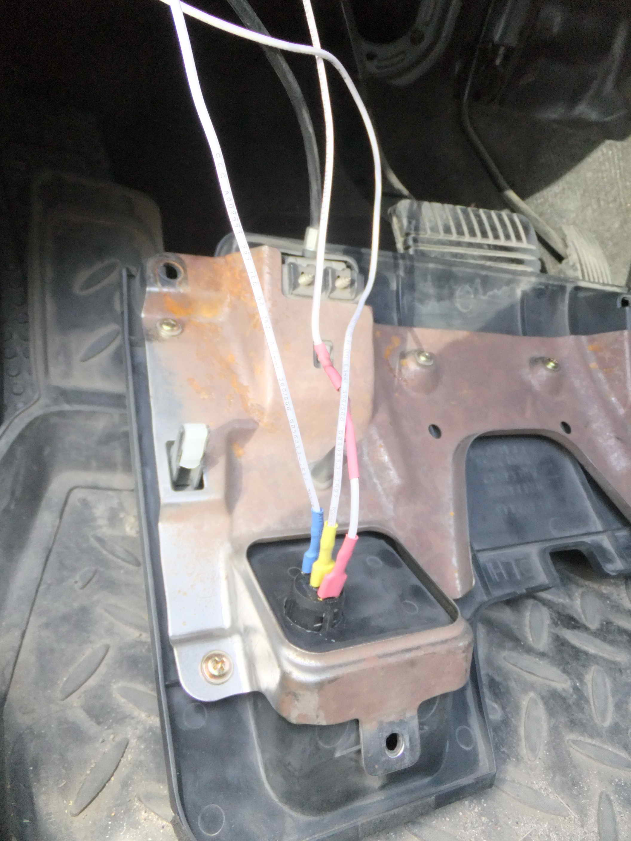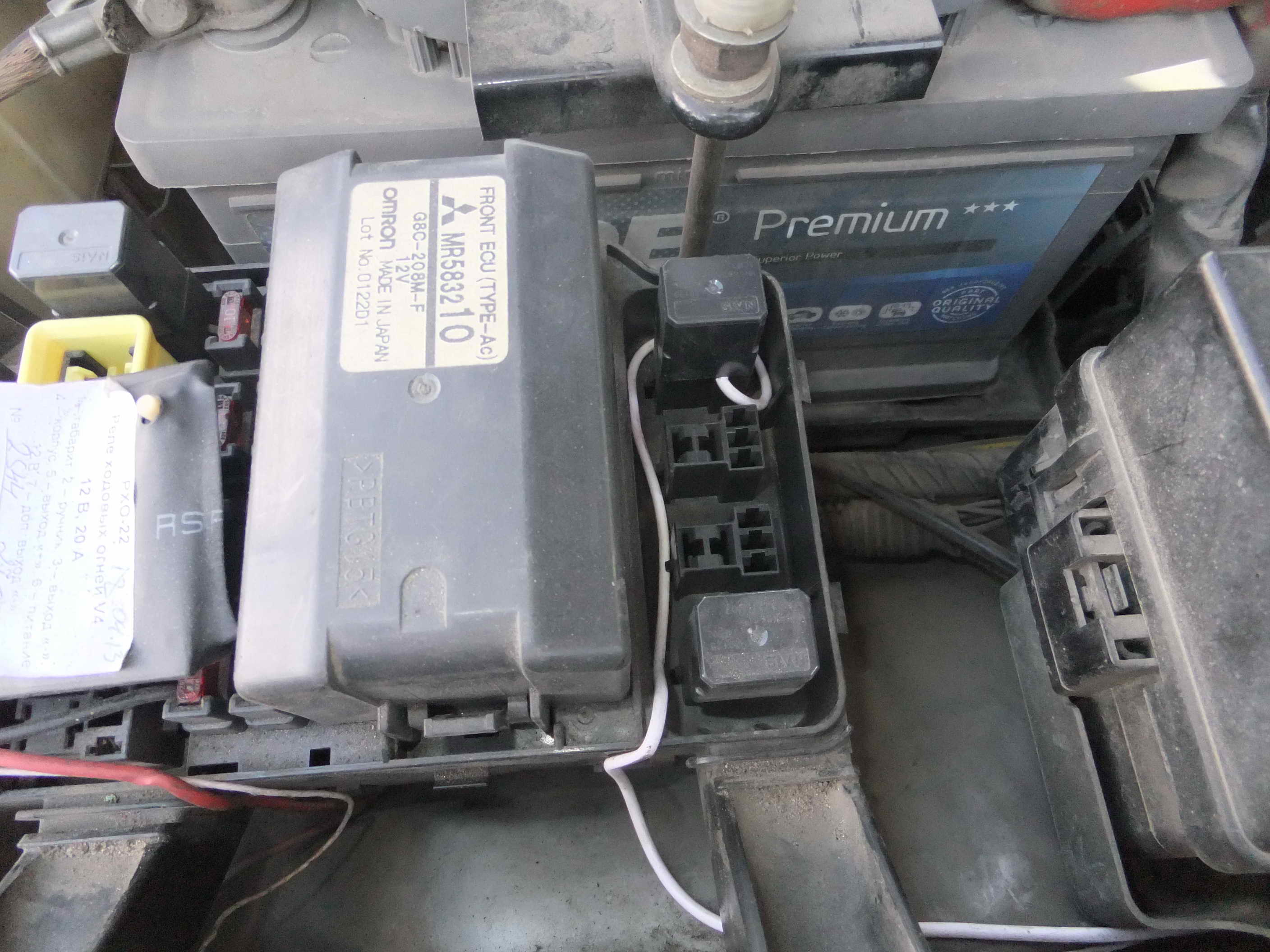 Провод от реле обжат наконечником и подключен к среднему выводу (желтый), на нижний вывод идет провод массы (синий). Для подсветки брошен провод на контакт подсветки (красный), питание взято с преда АБС (как вариант, можно с другого места, нагрузка минимальная), тоже зачищен конец и зажат предом.