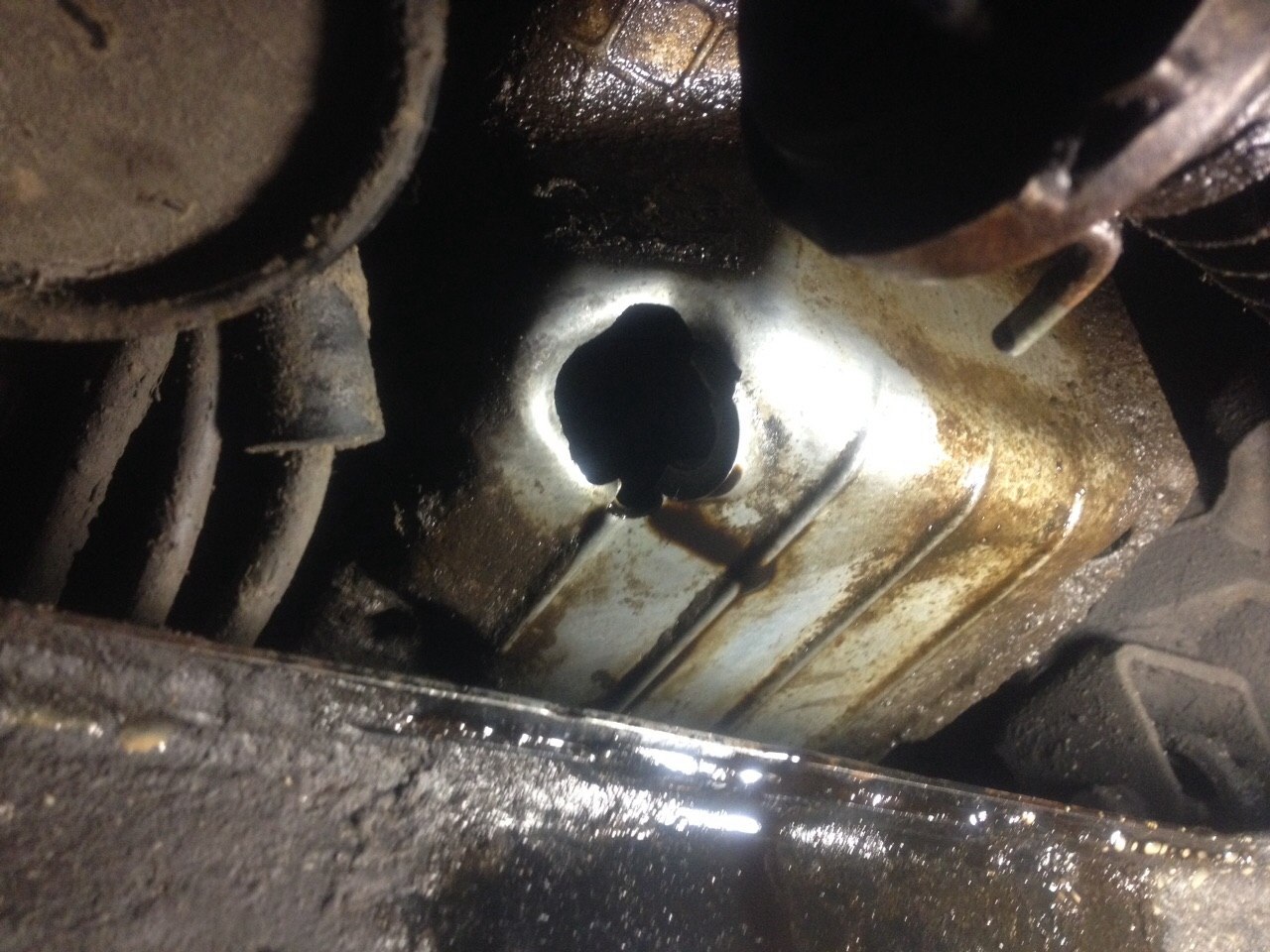 Вот такую вот проблему имеем. Решил поменять масло в ДВС, пробка-болт не откручивалась, в итоге дырка в поддоне. Радует факт, что вовремя масло решил поменять, ибо слилось 2 литра всего.