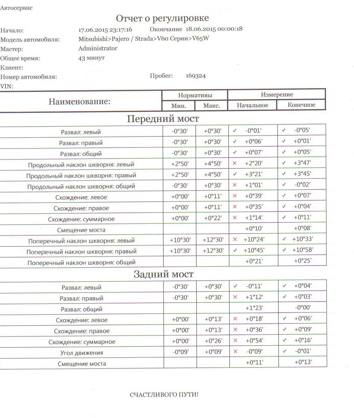 - вот отчет о регулировке - сделали сходразвал, все в зеленой зоне.