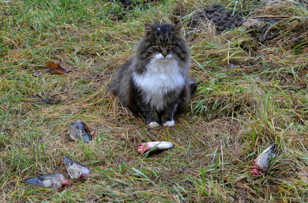 взялась щучка грамм 800 и по тихой воде со всплесками вытягиваю ее на песок. кот бросается к ней, предвкушая... но она как бы великовата, чтобы сразу глотать ее, но все же он решил понюхать ее в лицо и лизнуть на пробу. в этот момент щука радостно сократилась и закатила коту форменную оплеуху хвостом по морде! да так громко! кот отлетел и пока я снимал щуку с крючка- не подходил даже. лишь со стороны наблюдал. через три броска взялась щучка поменьше -около полукило. я ее специально водил у берега, чтобы кот заинтересовался. но он, как только рыбу вытащил на песок- наоборот отпрянул от нее. самое интересное: почистил я этих рыбок и пойманых ранее и отдал ему головы. обычно он их выгрызал так, что птицам нечего было доедать. и хотя прошло около часа после щучьей оплеухе коту, он сидел среди голов и не притрагивался к ним