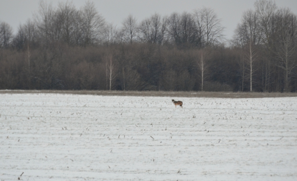 поехал на рыбалку 1 января с раннего утра. на шоссе (170 км в один конец) - где и так неинтенсивное движение - практически пусто. на рассвете (гард. -17) вижу волка, перебегающего шоссе в полукилометре от меня. пока подъехал ближе - он уже ушел на поле и метрах в 400 остановился рассмотреть опасность. фотать было плохо: мало света, короткая нужна выдержка, да и телевик около 450 мм. выкладываю, что получилось.