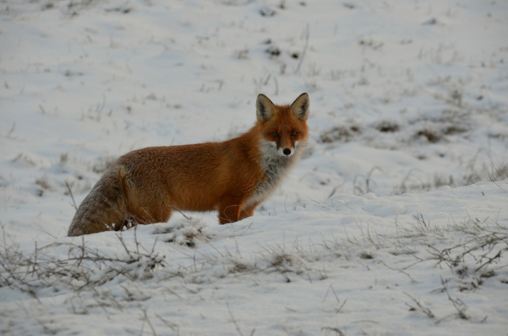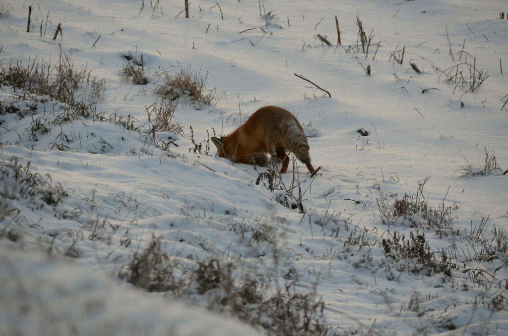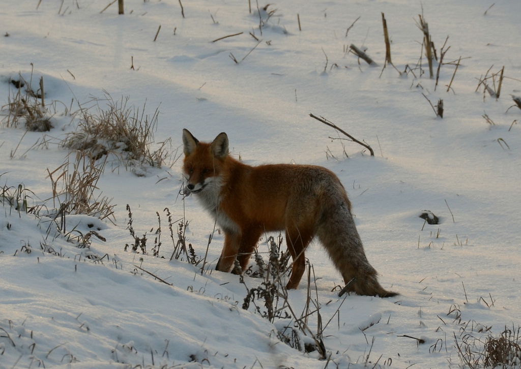еде далее: вижу на шоссе лисицу. увидев авто, она отходит на обочину. останавливаюсь, фотаю через окно. она не тревожится. выхожу из авто - она индеферентна! (метрах в 15 от меня) думаю: "видимо бешенная, раз не боится". однако, бешенные обычно облезлые, а эта как с картинки. далоее лисица неспеша переходит шоссе и на обочине начинает мышковать: суется носом под снег, где мышиные тропы. я жду; вот она унюхала мышь и схватила ее. раз сразу не проглотила, а понесла во рту- значит самка, несущая корм лисятам. весьма редкая встреча!