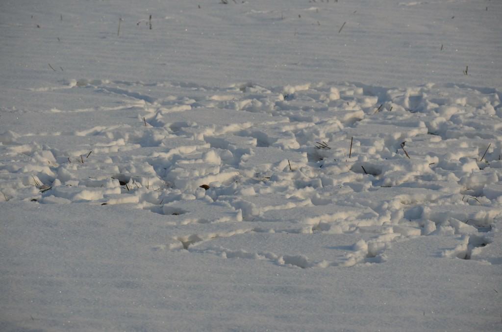 на рыбалке: иду по льду, смотрю на берег: рядом какой то потревоженный снег- вроде как кто то ходил, непонятное повреждение снежного покрова. остановился, жду. вдруг из под снега вылезают куропатки и двигают дальше, прячась в снегу (порядок фоток неверно вставляется: вначале нижний снимок, затем верхний)