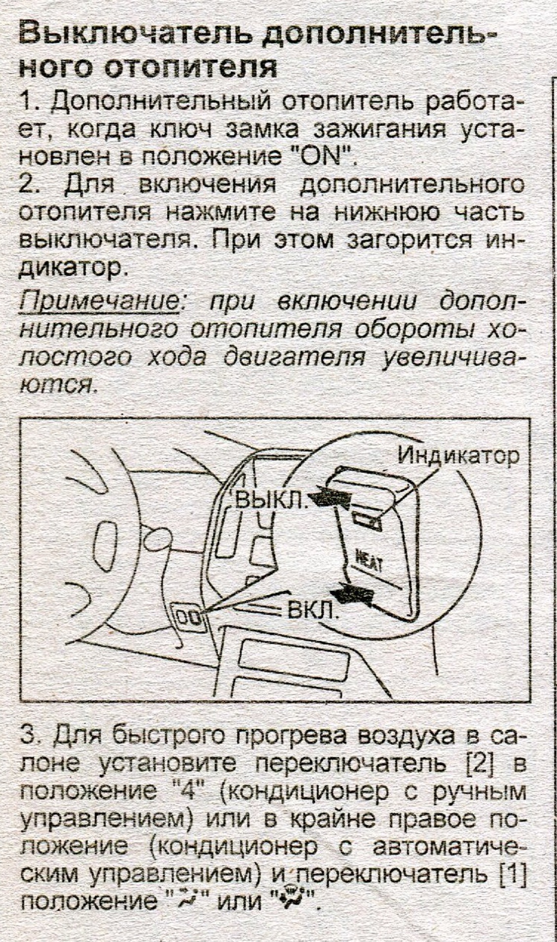 Я пробовал: основной отопитель - температура на максимум, направление на лобовое, скорость авто - на дисплее компа появляется символ обогрева лобового, но воздух идет холодный. С задним также - все на максимум, воздух холодный до прогрева двигателя.