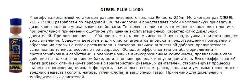 "Высокоэффективное средство для дизельного топлива, очищающее сажевый фильтр и продлевающий срок его службы. Регулярная добавка присадки поддерживает сажевый фильтр в чистоте..." - и дальше бла-бла-бла на сайте.