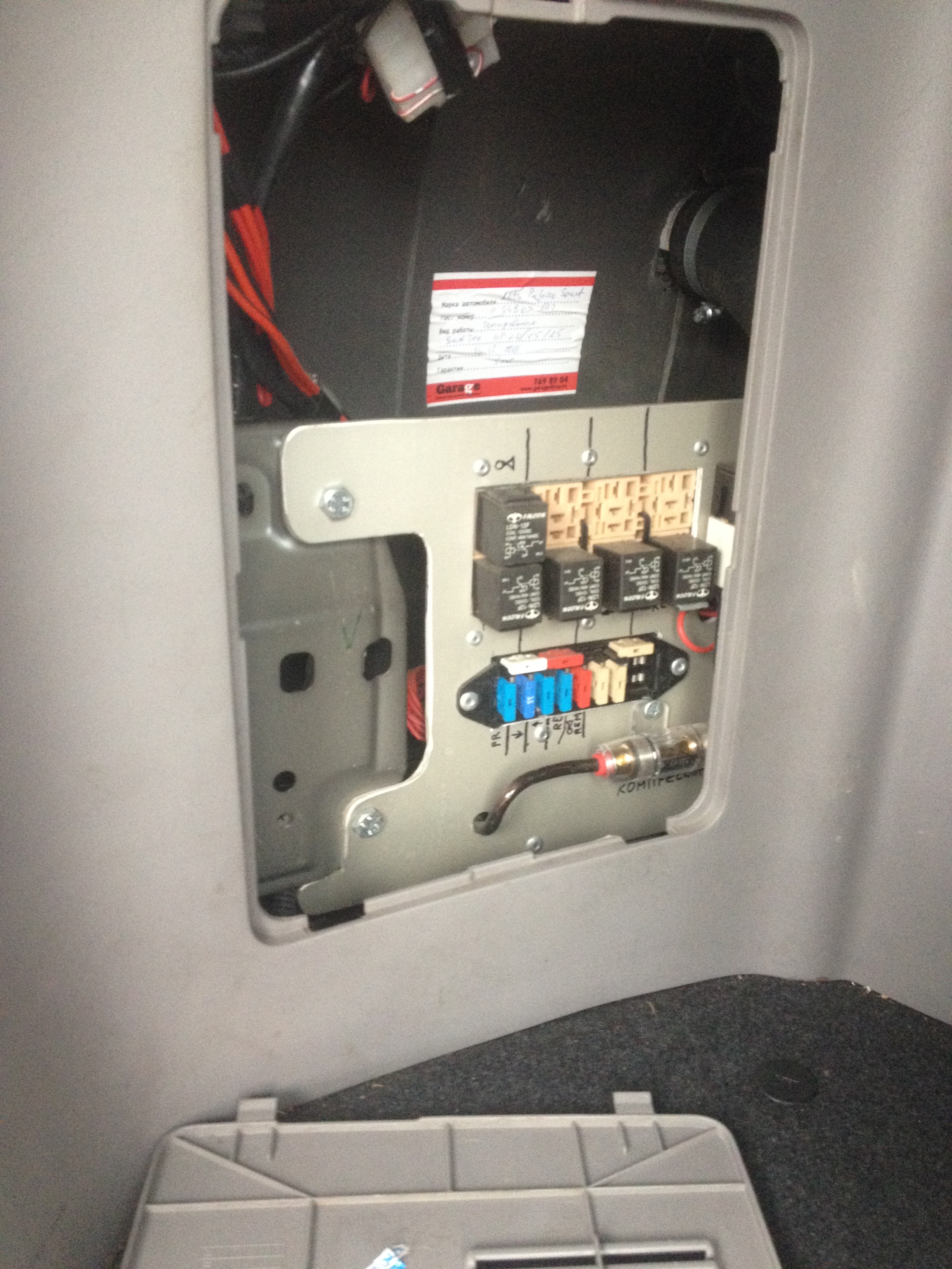 2. Изготовление монтажного блока подразумевает, что Вы получаете некую структурированную "гроздь" все тех же комплектующих, но не только в одном месте, но и в хорошем доступе к нему. Как правило мы не жадничаем и монтажный блок состоит из: вводного предохранителя (60-100А), разветвителя, 5-7 реле (40А), 1 реле для компрессора и 10-12 гнезд под флажковые предохранители. 90% случаев монтажный блок устанавливается в багажнике (в крыле), что позволяет в будущем дополнительно установить силовую розетку, инвертер, усилитель и все что угодно без лишних телодвижений.