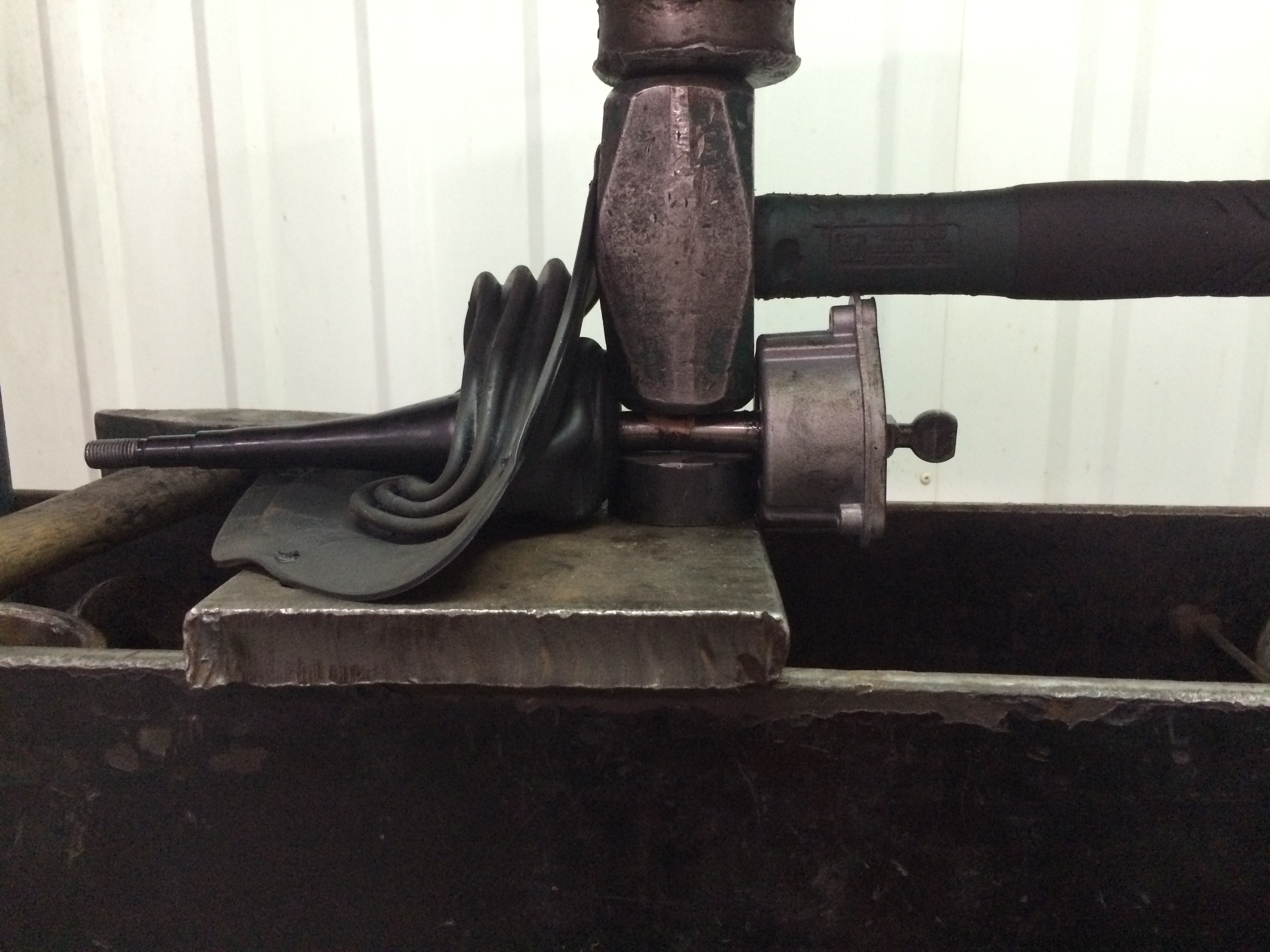 Решили гнуть на прессе, вот так В этом месте (изгиба) удалось просадить линию на 2 мм, это на конце рычага дало необходимые 8-10мм зазора, зажали рычаг между двух кувалд и оставили на час, т.к. как я писал ранее метал рычага "с памятью".