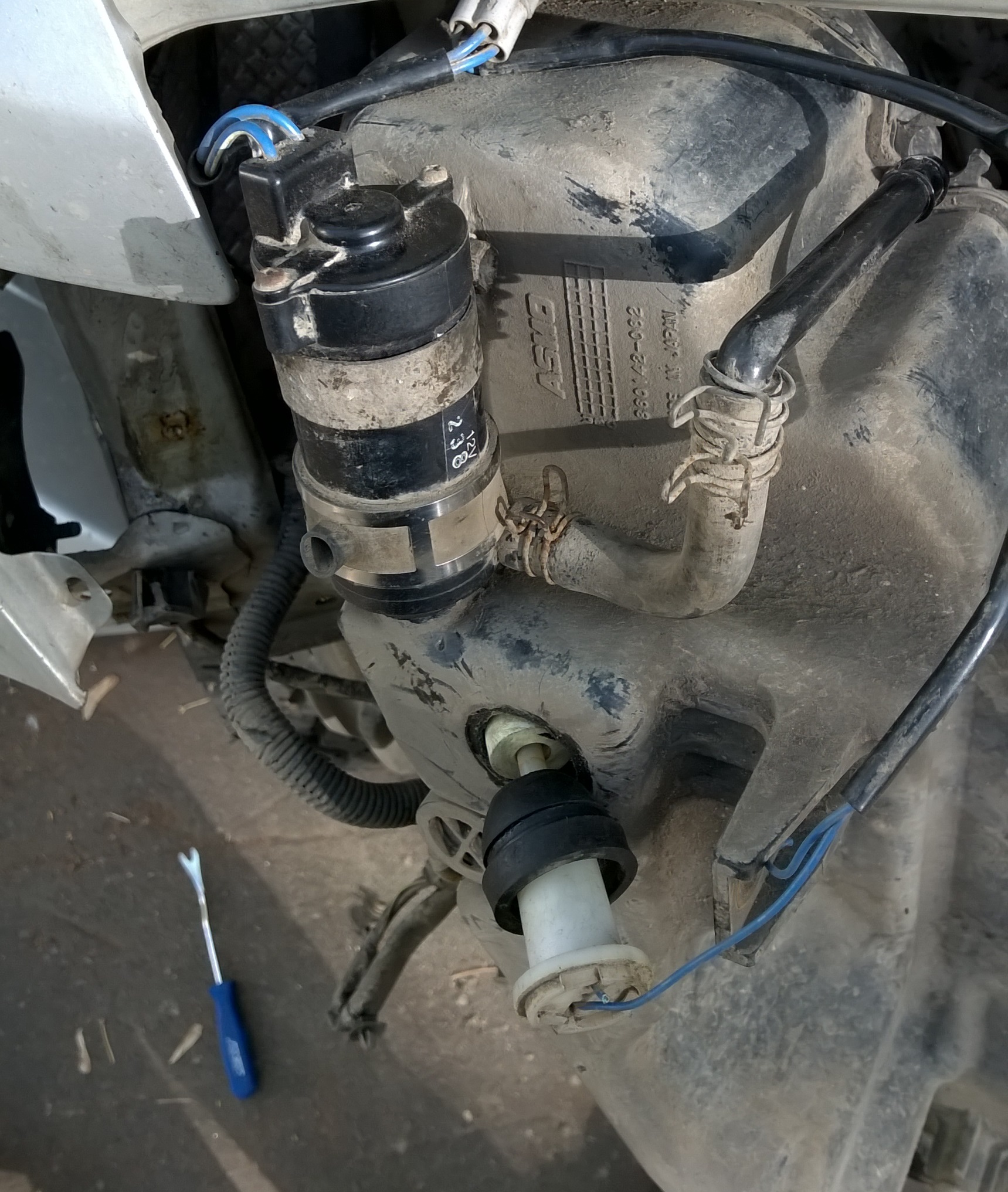 Окручиваем бак с омывайкой, внимательно на него смотрим и видим две намеченные, но не сделанные, окружности под дырки. В верхнюю пойдет моторчик омывателя фар, в боковую - поплавок уровня жидкости (вернее, боковую и нижнюю, если бачок стоит в своей законной плоскости):