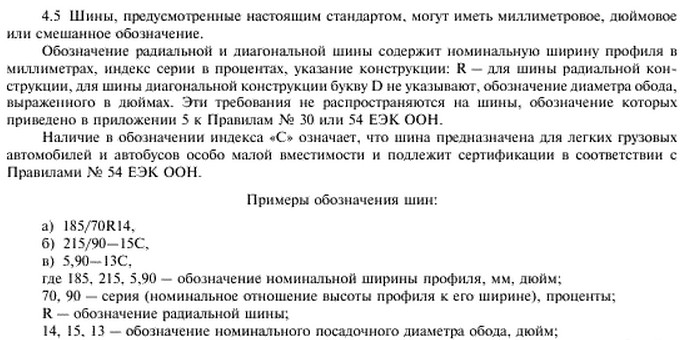 В маркировках шин (ГОСТ 4754-97 Шины пневматические для легковых автомобилей, прицепов к ним, легких грузовых автомобилей и автобусов особо малой вместимости. Технические условия):