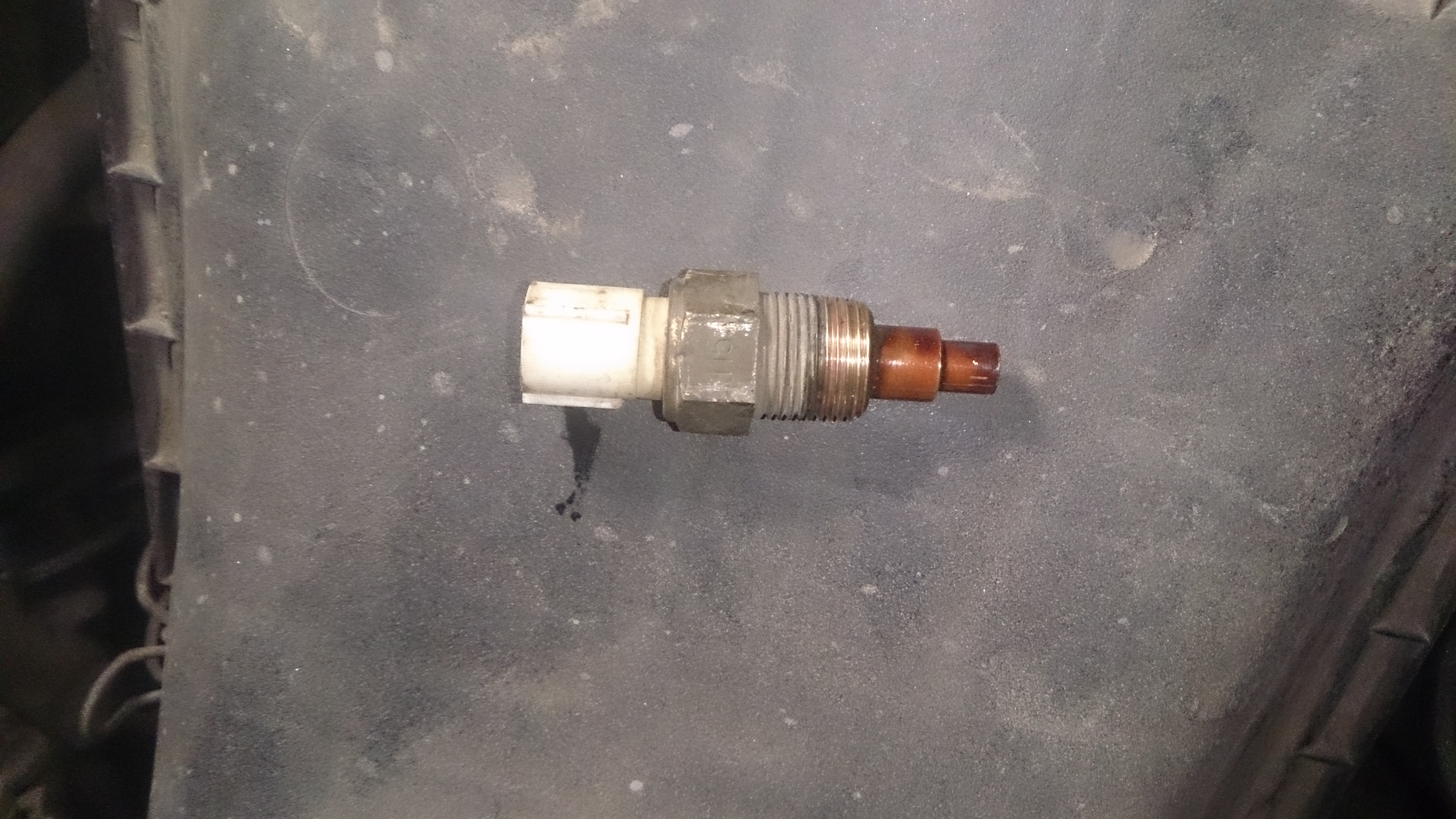 Замерил сопротивление на двухконтактном датчике температуры - сопротивление не меняется плавно по мере нагрева двигателя, а прыгает туда-сюда, нестабильно. Решил, что проблема в этом датчике. На фото тот что с чёрным наконечником, показываю на него пальцем. Заказал через экзист. По вин-коду показывает оригинальный датчик MD 149338, тот что номер 10803 на схеме.