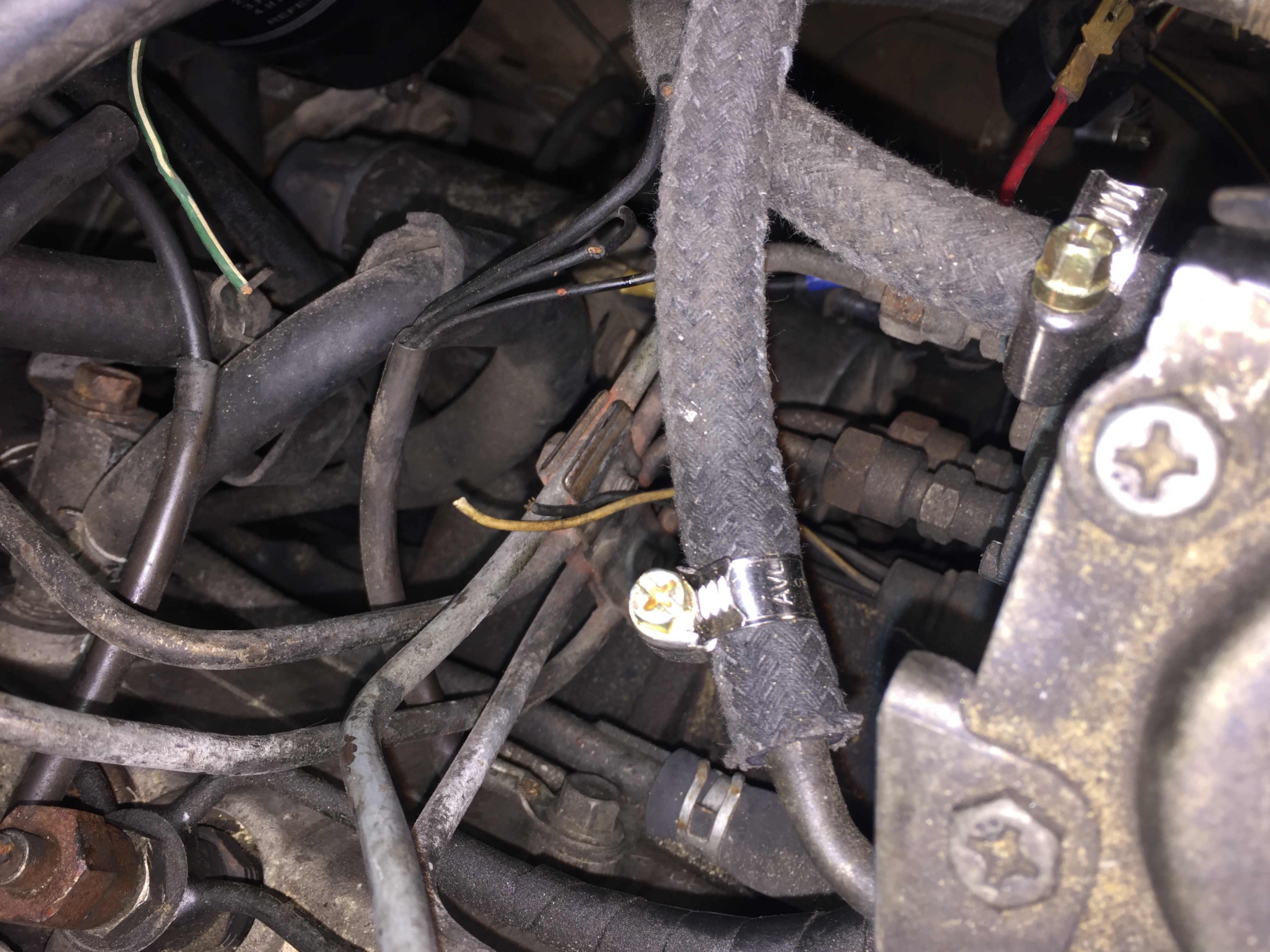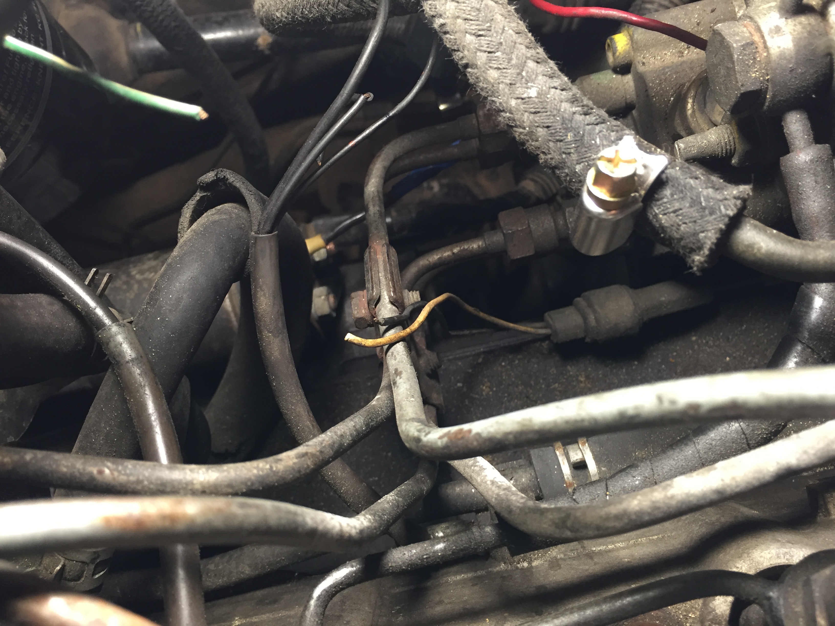 — фото №5: (извиняюсь, но лучше сфотографировать не получилось) три черных провода, два одинакового сечения, один немного толще, собраны в конце в одну обмотку и через одну круглую клему прикручены болтиком к головке блока примерно под третьей форсункой (на фото в центре, болтик с клемой слева в центре), все три — если я правильно понимаю — провода массы, но только чего, каких узлов? Все три обрезаны;