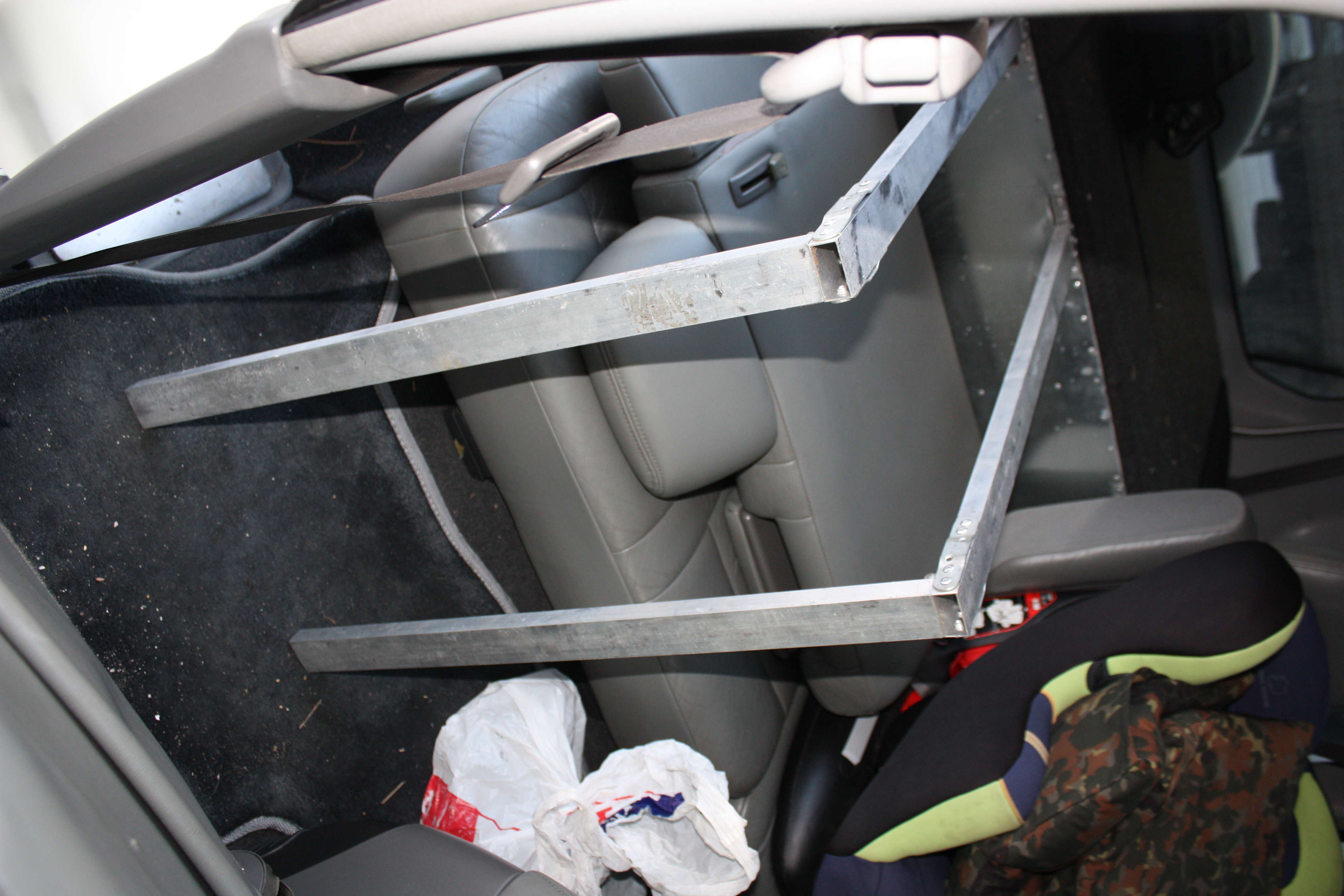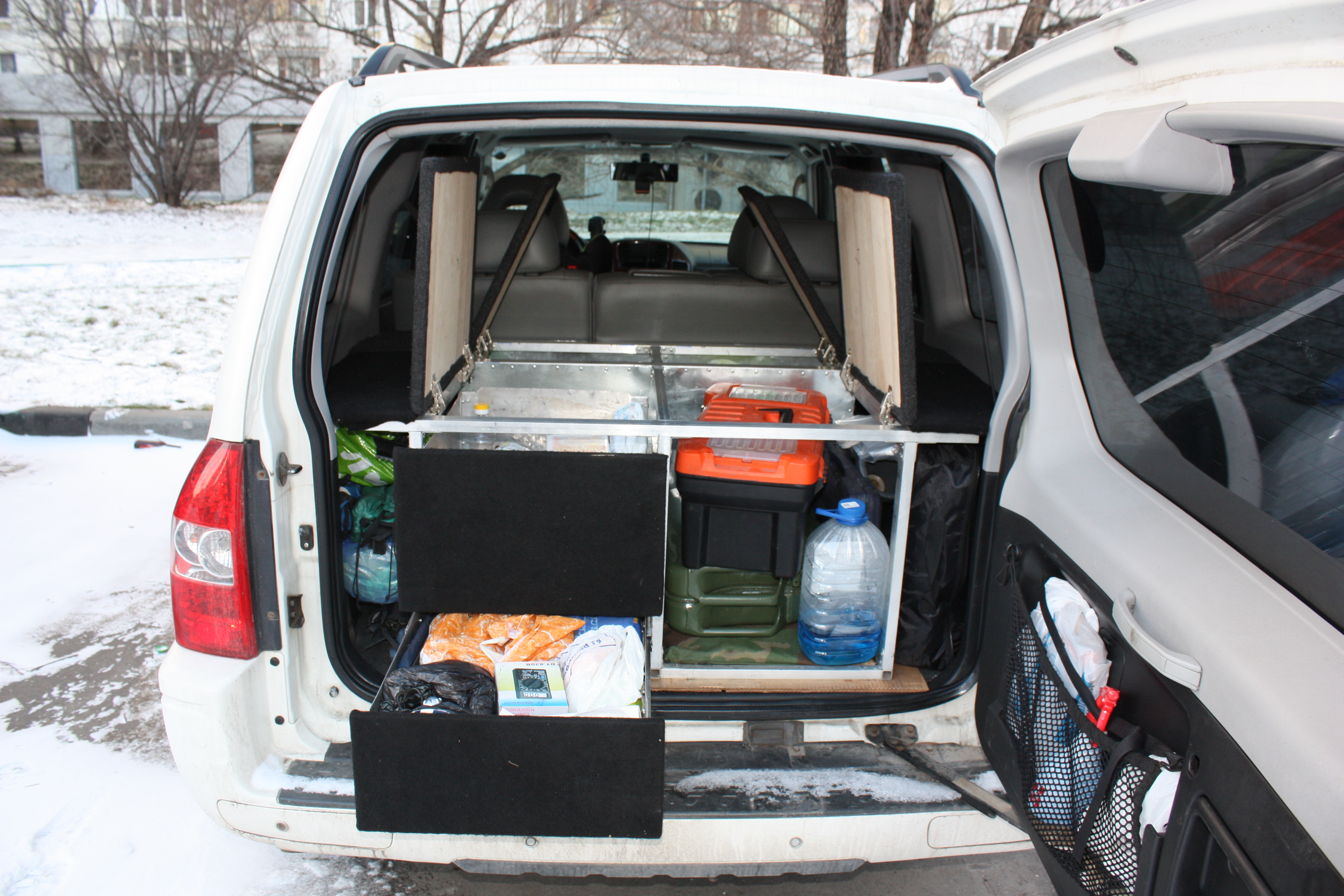 Делалась собственноручно на П2 по образцу полок Скитальца, состоит из двух частей - багажной полки с ящиками в багажнике, и надставки с ножками над сложенными сиденьями второго ряда.