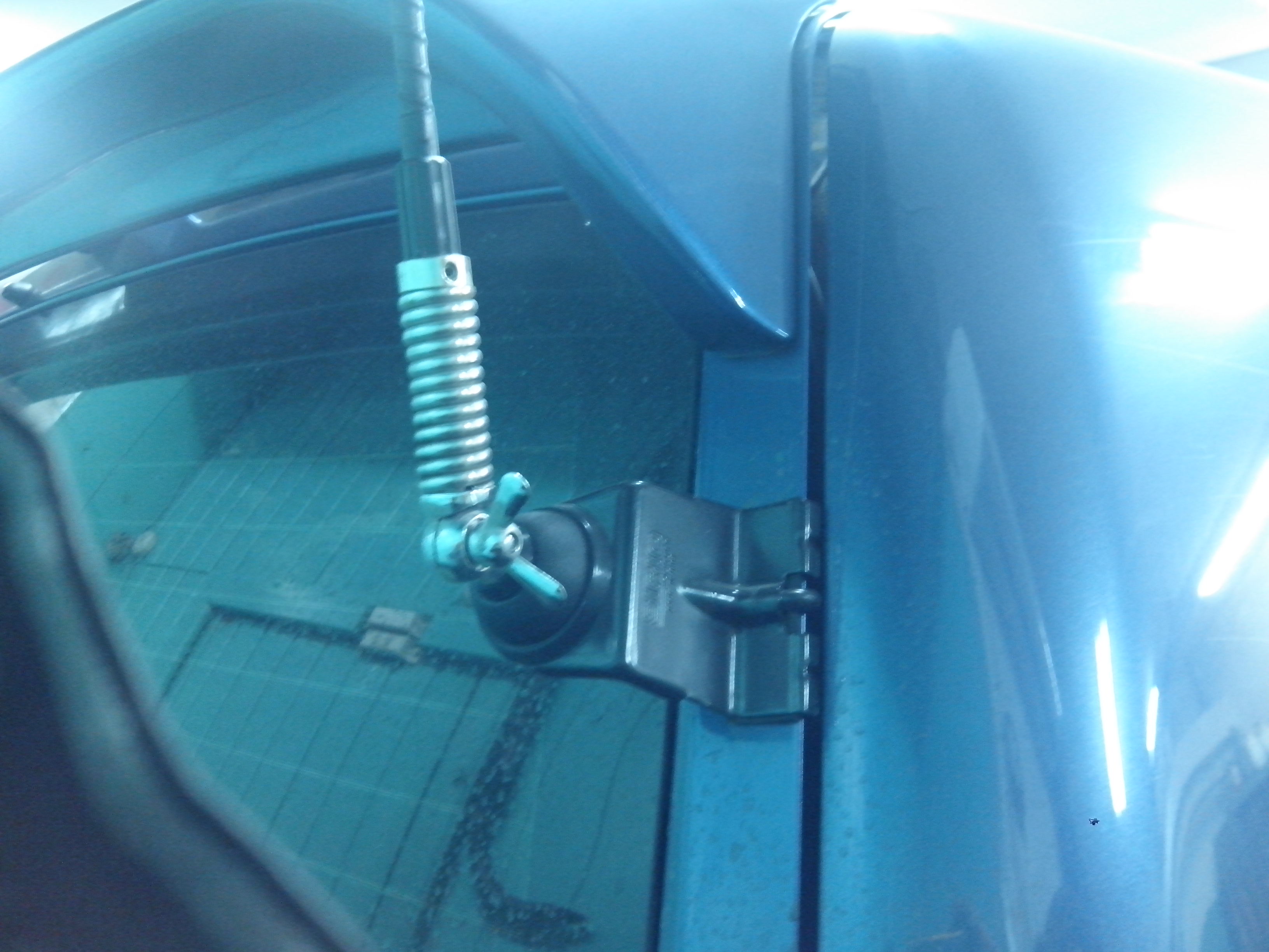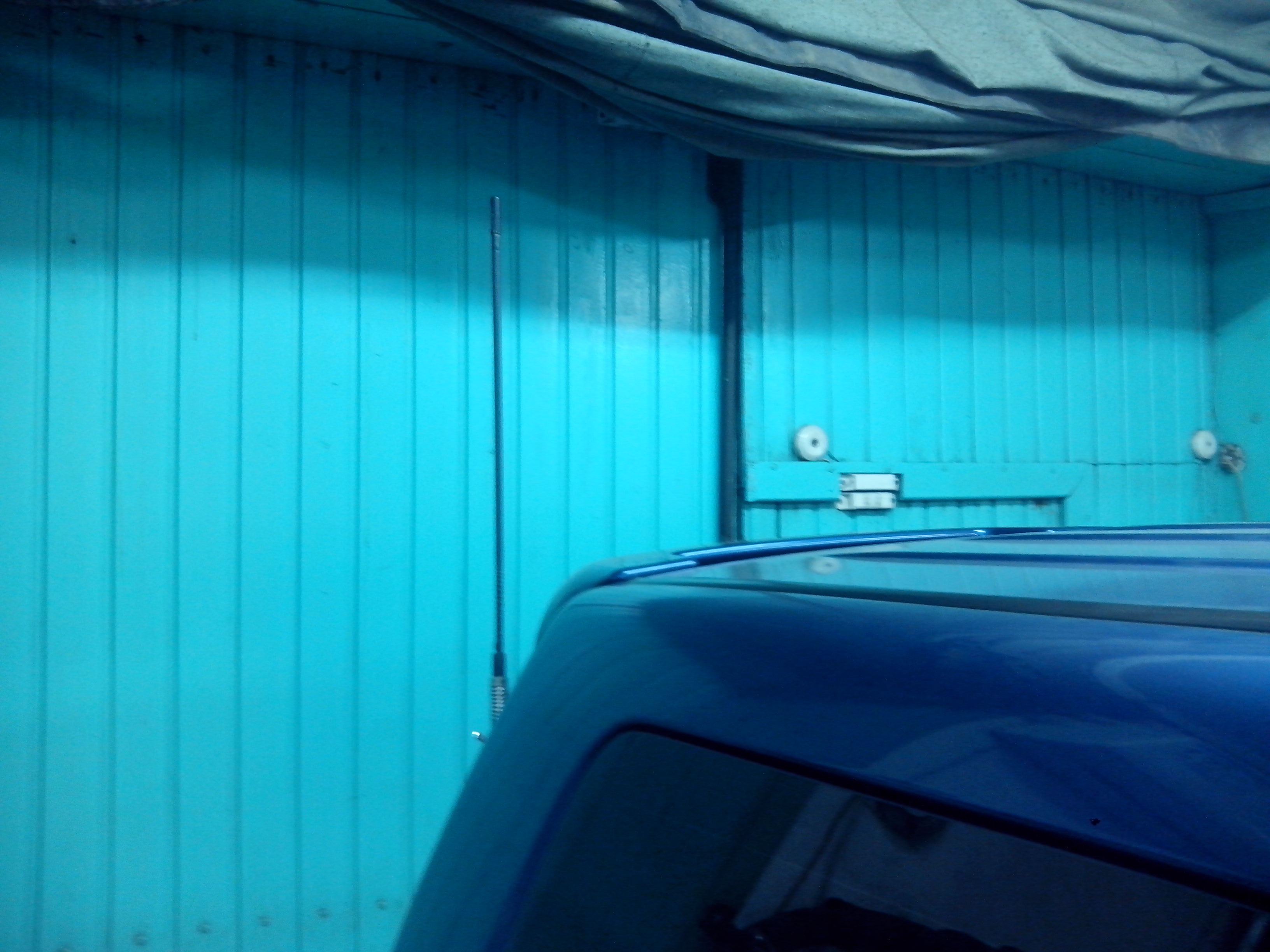 Антенну вымерил по высоте ворот и установил на пятую дверь, что б максимально высоко и не задевала об проём ворот. На простенький кронштейн, купленный вместе с рацией. Провод у антенны был 4 м. Протянул максимально скрыто под обшивками. И этой длинны хватило впритык до "под сиденье".