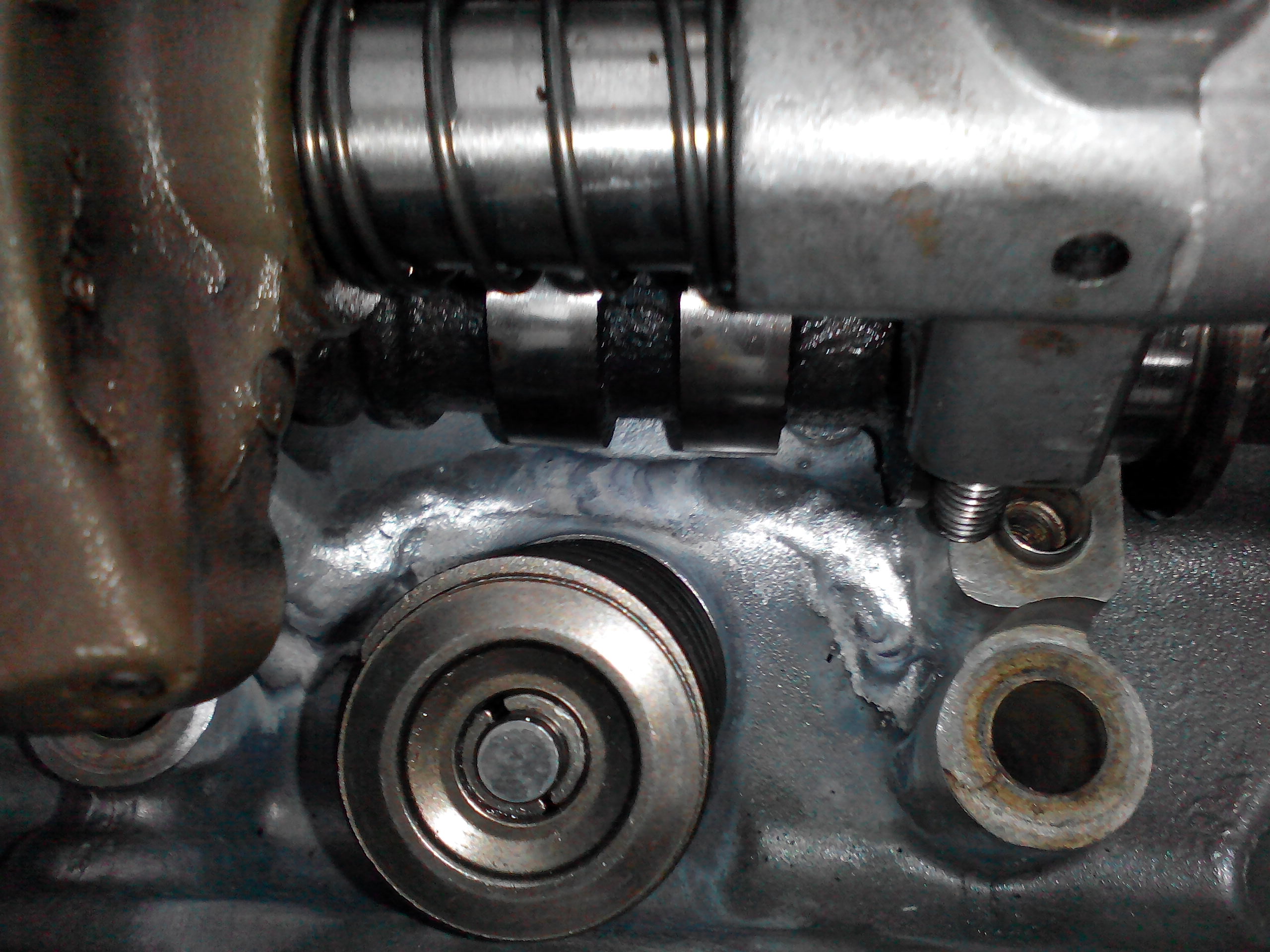 Даю: поршневая с кольцами, все по ГРМ, прокладки, расточка и хонг блока в ООО "механика", шлифовка колена там же, вкладыши, помпа. Неожиданно появилась неприятность с гбц -трещина под крышкой клапанов. Фотки есть потом пришпилю. Заварили головку собрали, погоняли в масле тосол. Пришлось снова разбирать и менять голову. Мне повезло в сугробе нашелся двигатель от Крайслера, гбц мне практически подарили. В Москве нашли новую голую не оригинал за 20000.