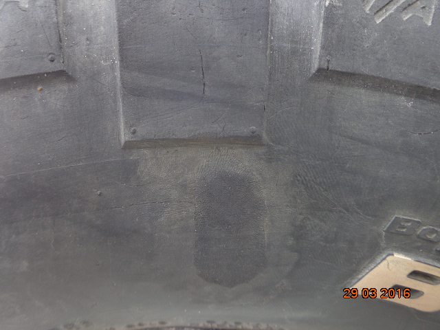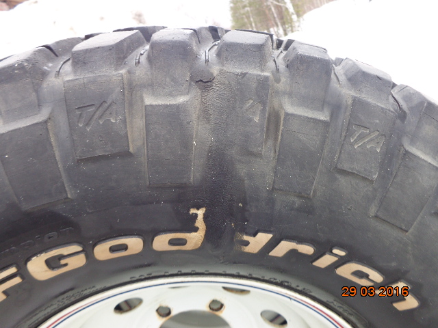 Продам 4 колеса BFGoodrich Mud-Terrain 33/12,5R15 на стальных дисках шириной 8" и вылетом -19. Выпуск 2011г. Протектор 11-12 мм. Трещин нет. На одной шине был порез на боковине. Отремонтирован, 3 года с заплатой езжу, грыжи нет. На другом несквозной порезик, тоже отремонтирован. На одном диске небольшая вмятина.