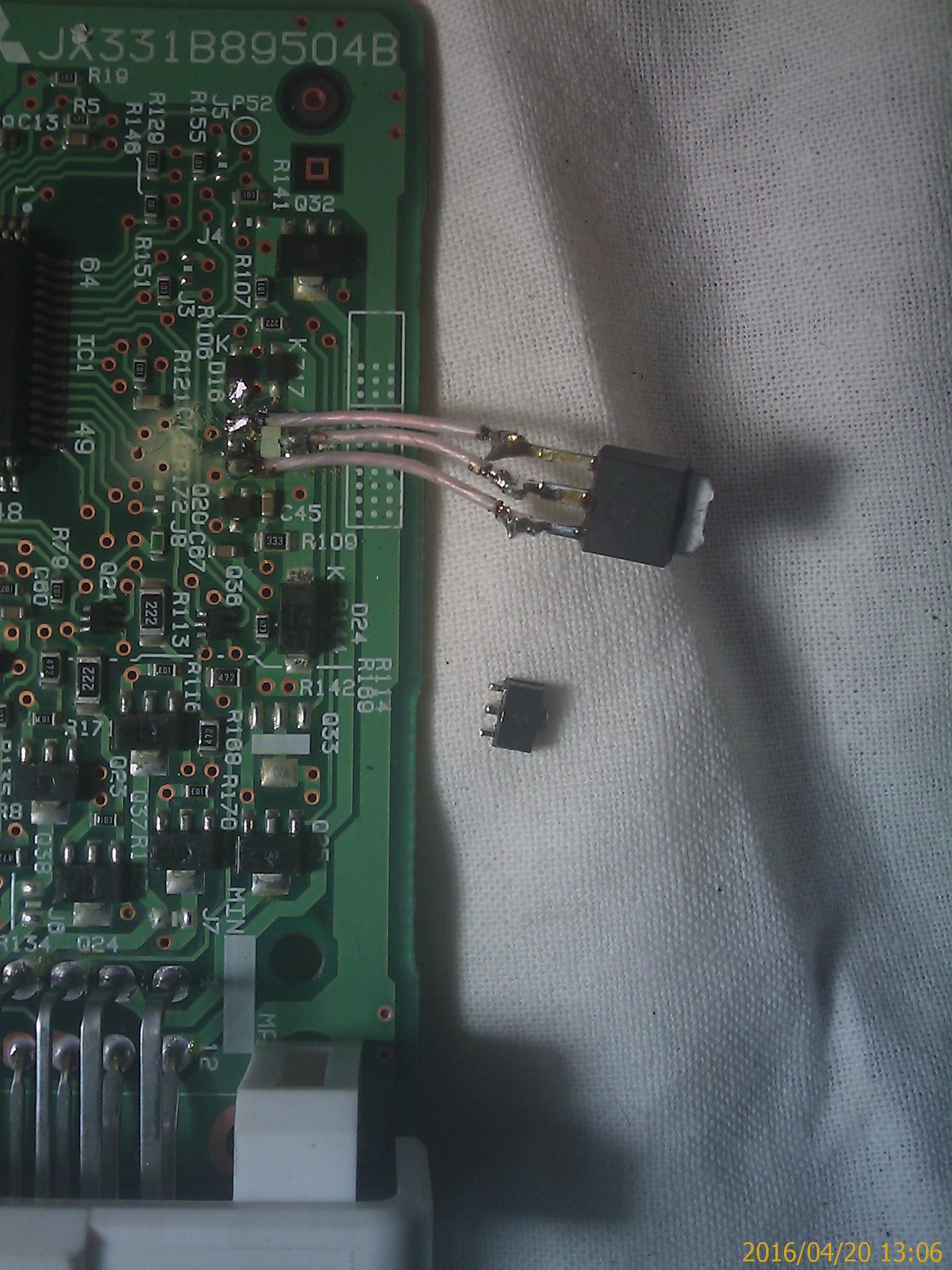 Это блок управления раздаткой mr580114,предыстория ,при подключении неродных ваккумных электроклапанов включения отключения муфты переднего моста через некоторое время вышел из строя каскад управления зл.клапанами переднего моста на транзисторе Q19,при переключении раздатки из 4H в 2H на 41 выоводе эбу раздаткой должен появляться отрицательный потенциал,тем самым включая вакуумные клапана,но потенциала нет ,на вход транзистора с меткой(KE)верхний, сигнал поступает от 43 ноги микроконтроллёра ,но транзистор не подаёт массу,диод D24 цел,думаю что всётаки убит транзистор,прошу помощи в поиске необходимого транзистора или аналога его