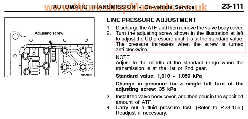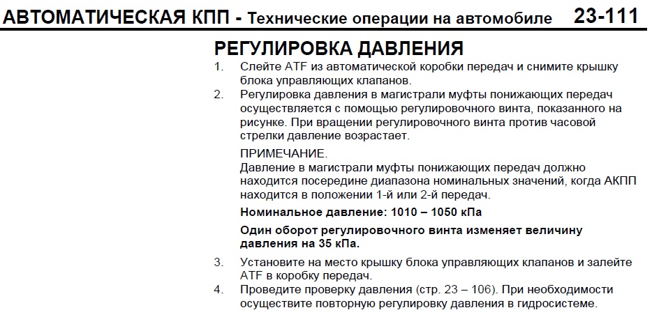 На трансмиссии есть контрольные точки, подключаете к ним манометр, заводите автомобиль и смотрите на сколько соответствует давление данным в мурзилке (лучше это делать на подъемнике с вывешенными колесами), ну а дальше сливаете жидкость, снимаете поддон и крутите болт в ту или иную сторону, один оборот болта равен какому то стандартному значению в Кпа (надо книжку смотреть на вскидку не помню), по часовой давление повышается, против часовой понижается.Dolf945 писал(а): А как отрегулировать болт регулировки давления в магистрали?, он у меня полностью закручен(