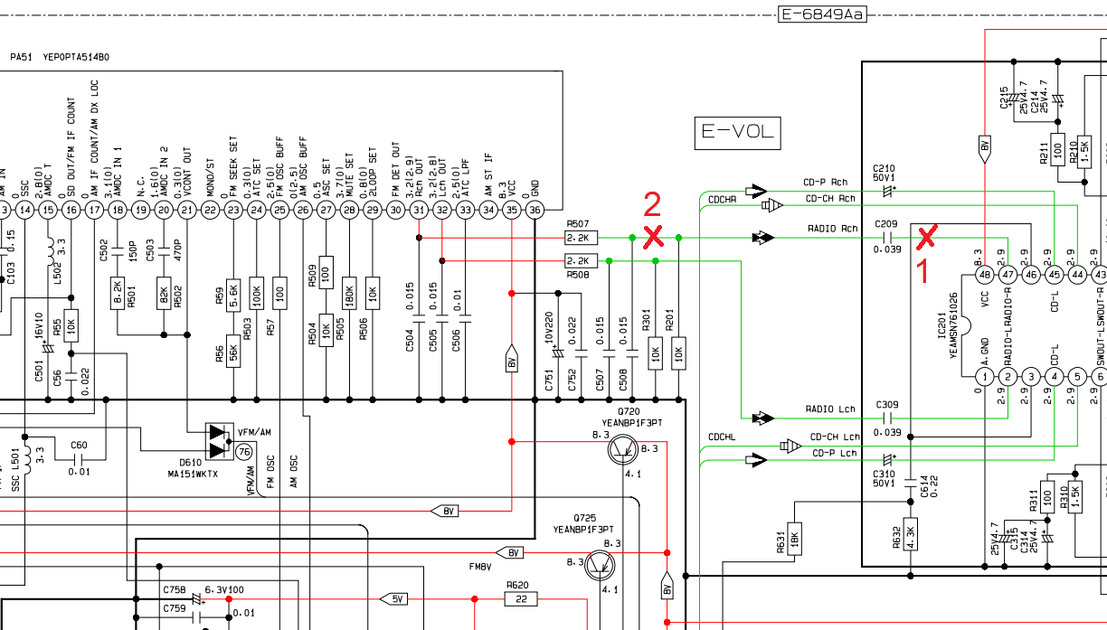Еще заметил, что если один канал перерезан (например правый), а второй целый, то звук радио слышно в обоих каналах, но в правом чуть тише. Схема врезки и схема магнитолы. Магнитола Mitsubishi MR587387 Infiniti P004 Panasonic CQ-JB0161A Service-Manual