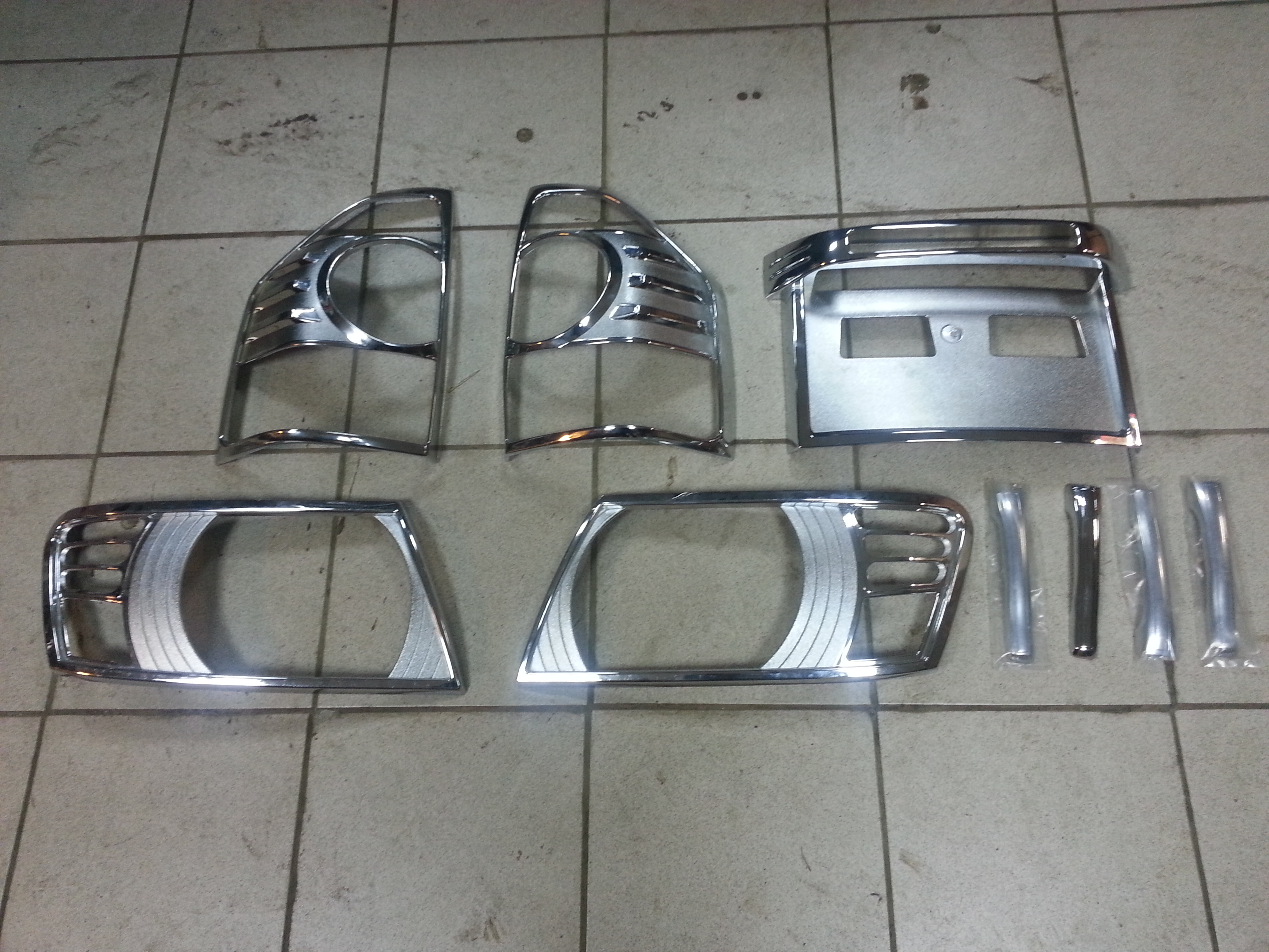 Продам хромированную накладку площадки под задний номер для Паджеро 3 рестайл,хромированные накладки на передние и задние фары,накладки дверных ручек.