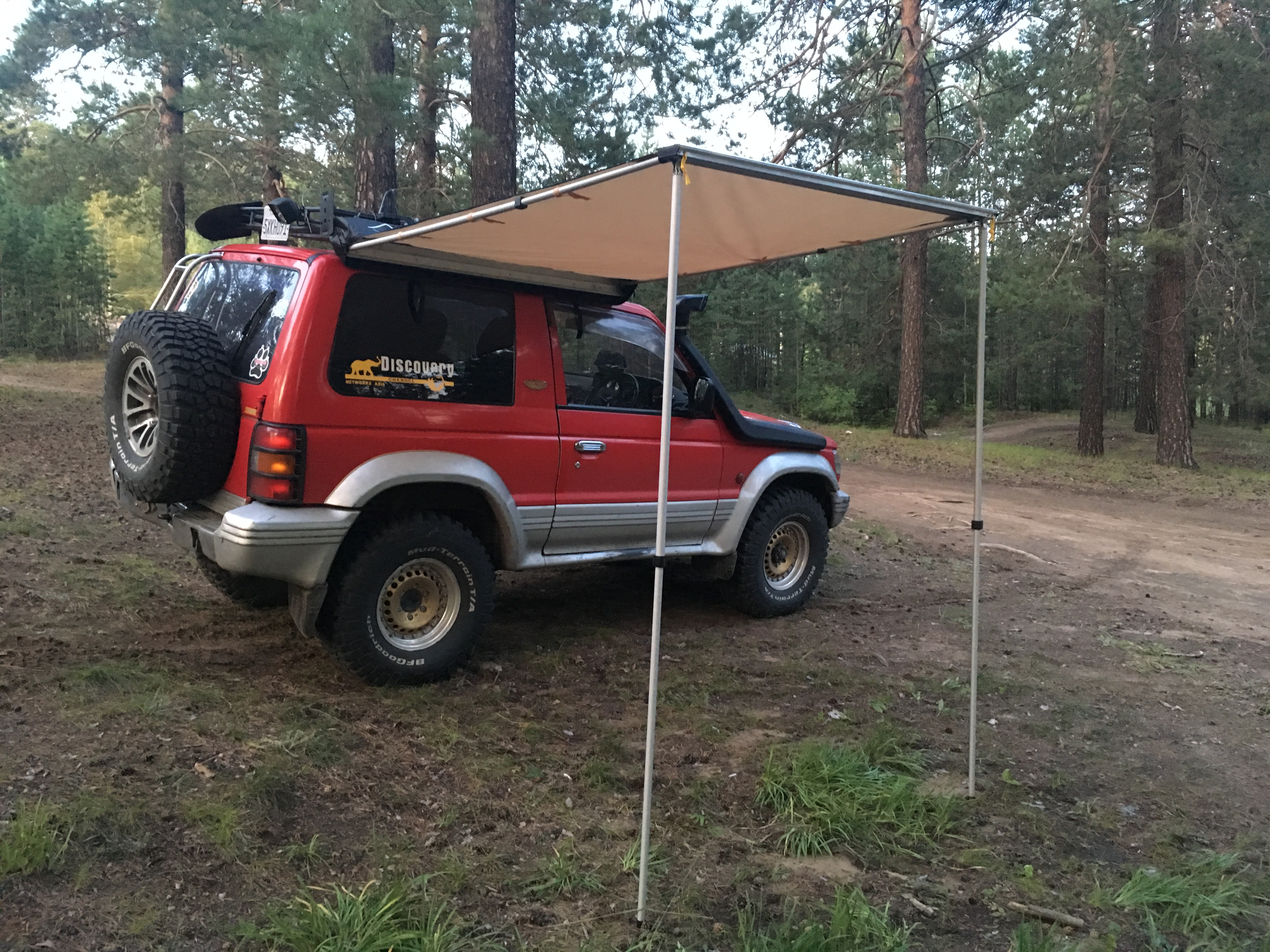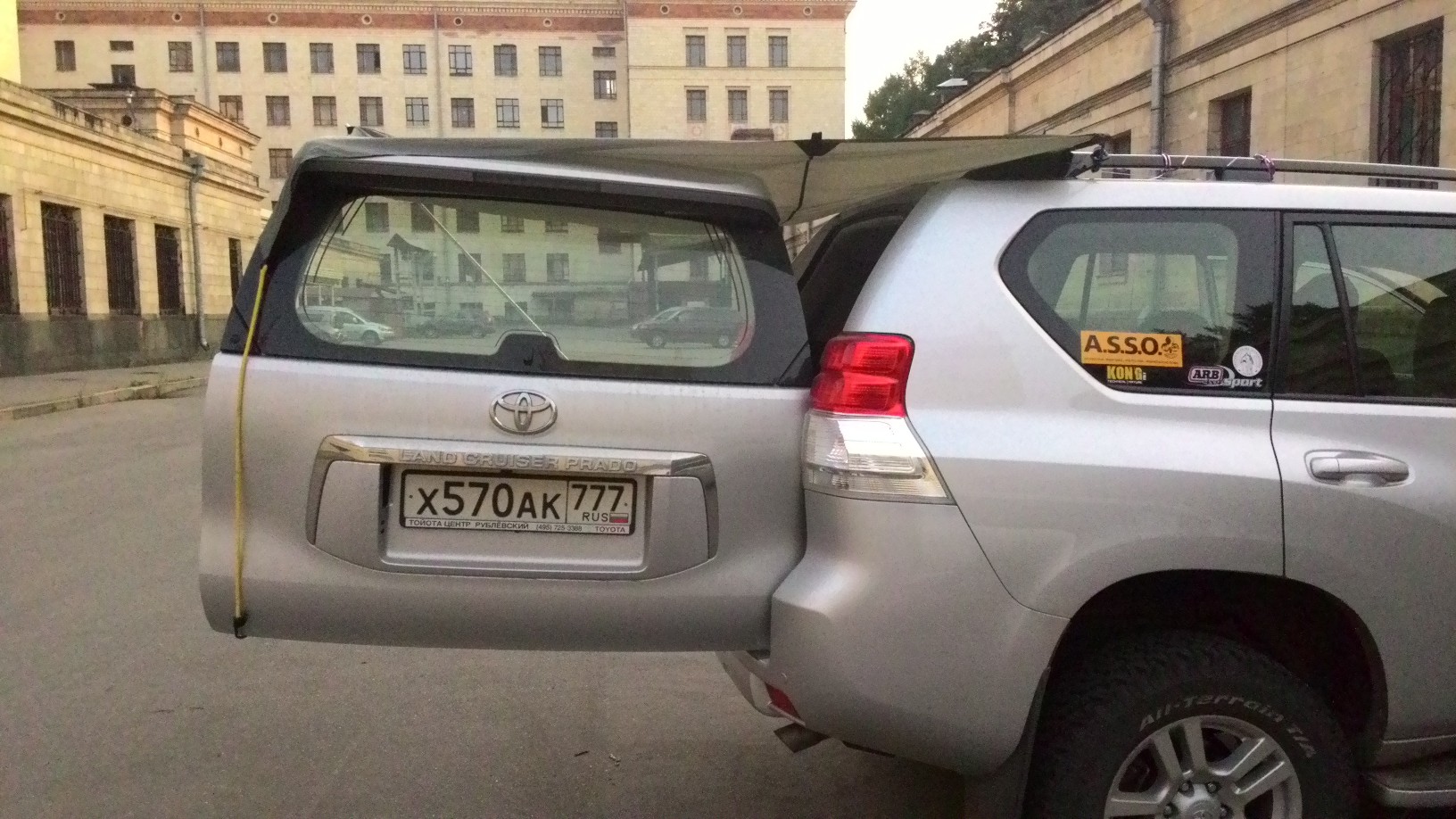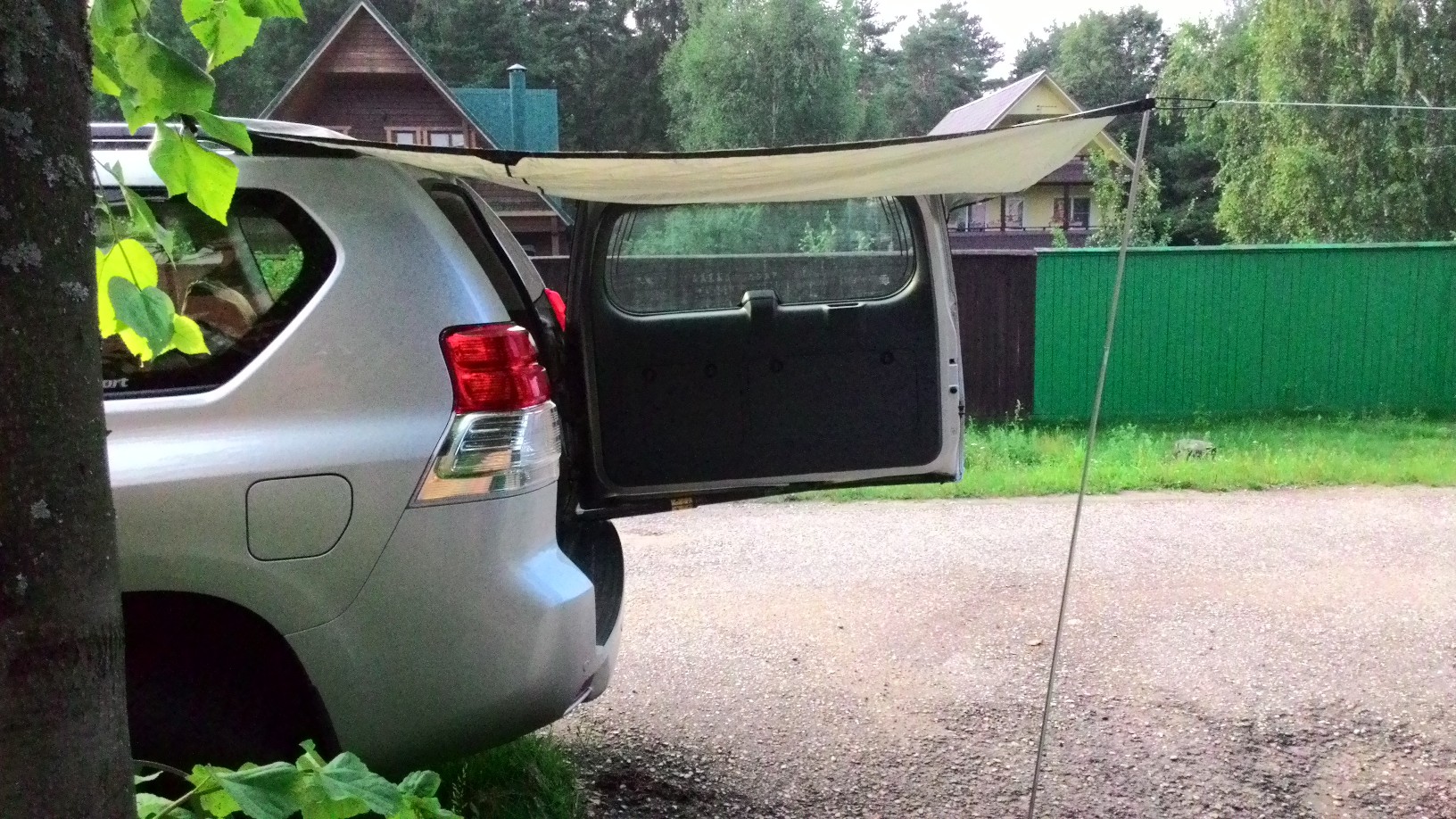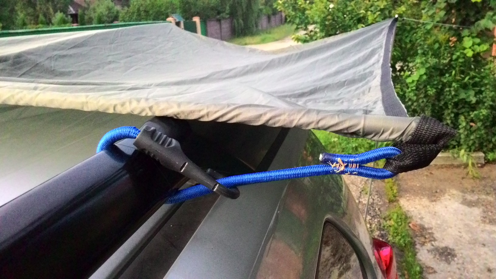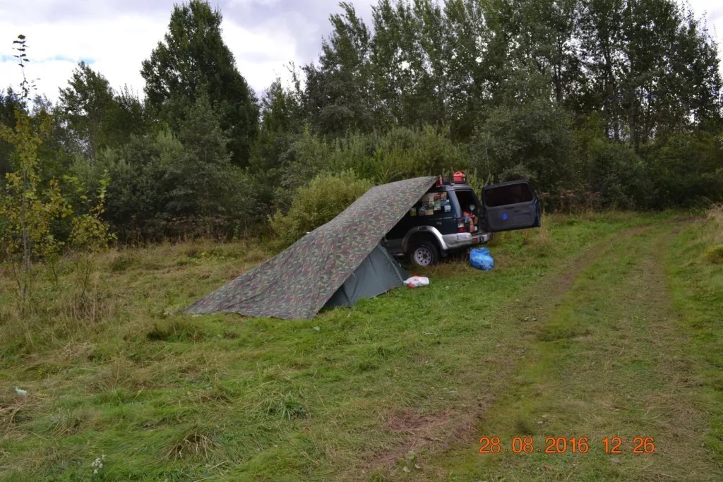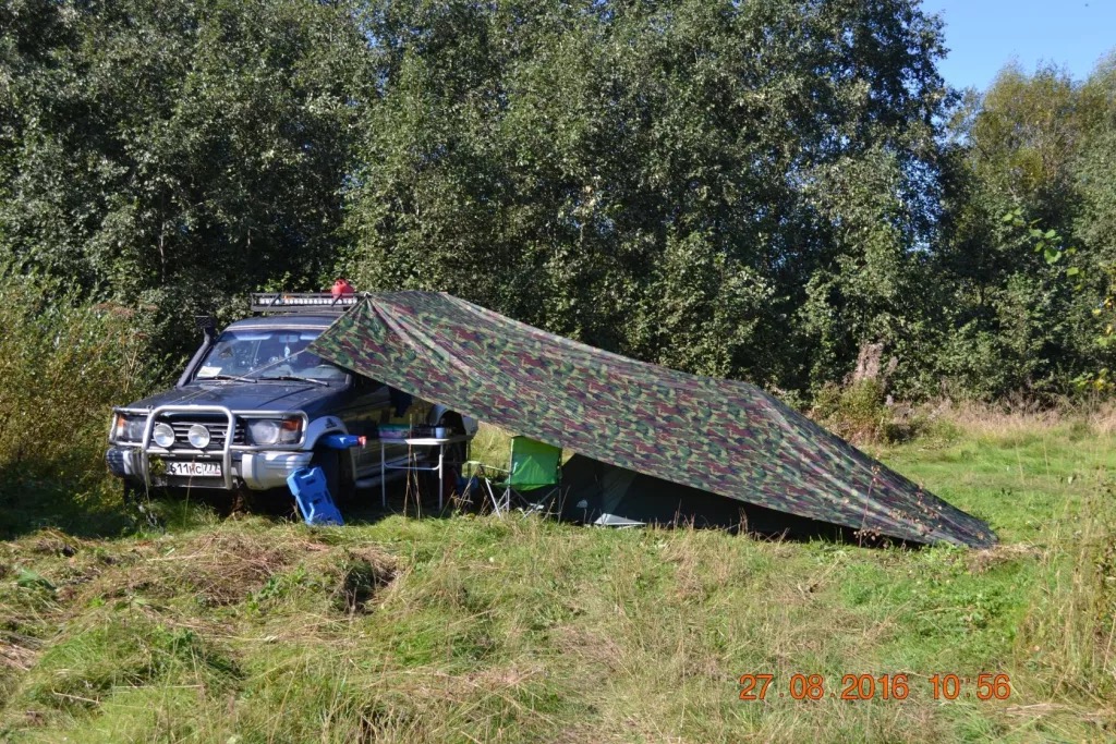 Также тент можно закрепить вдоль одного рейлинга, тогда он будет защищать от дождя две двери, это удобно при ночёвке в машине, чтобы залезать через дверь.