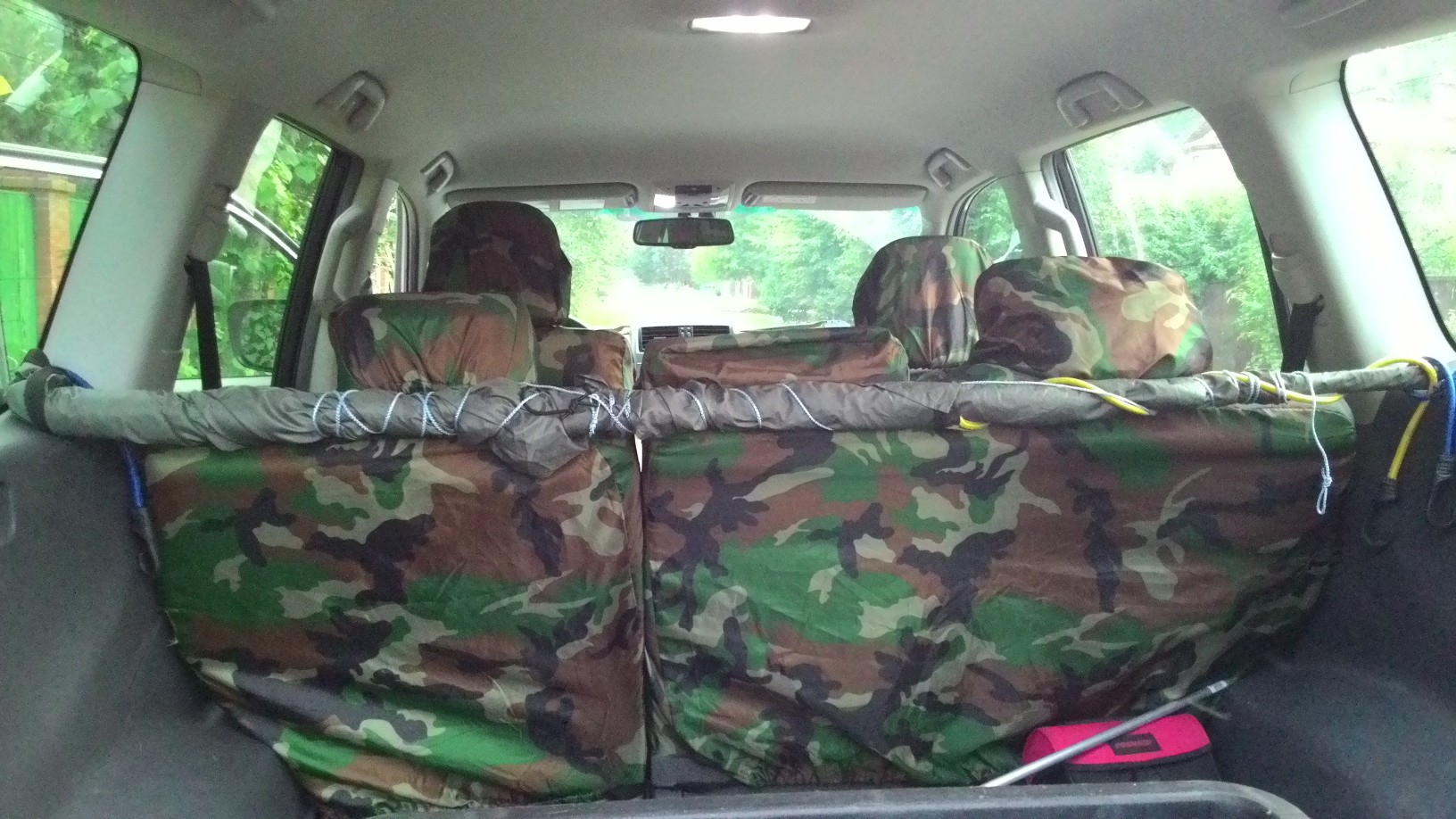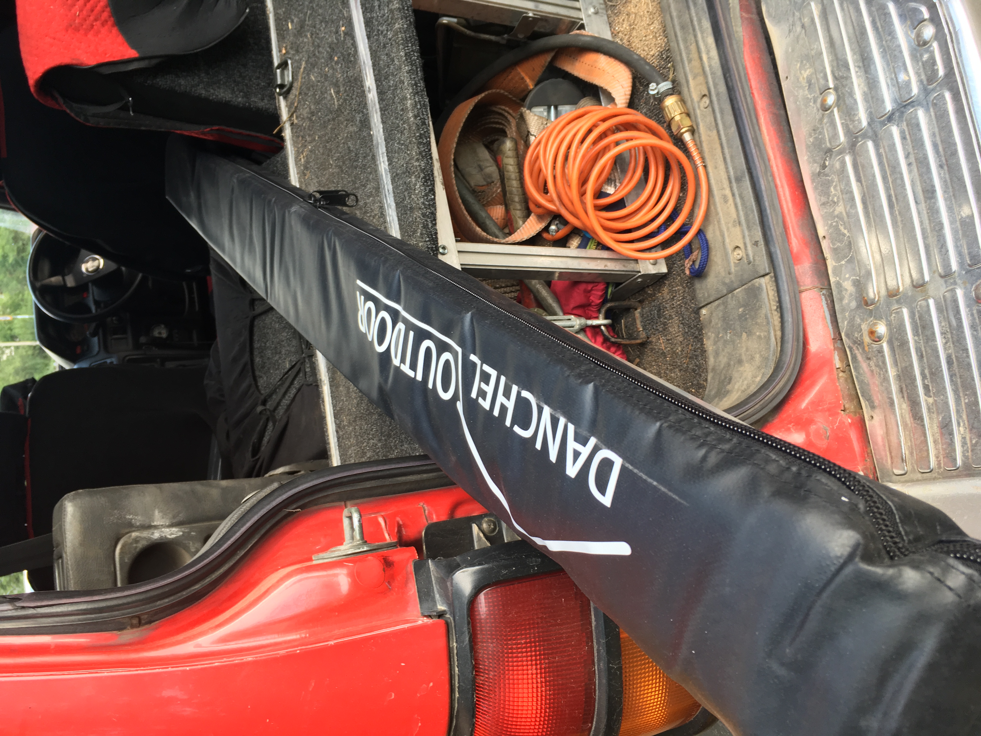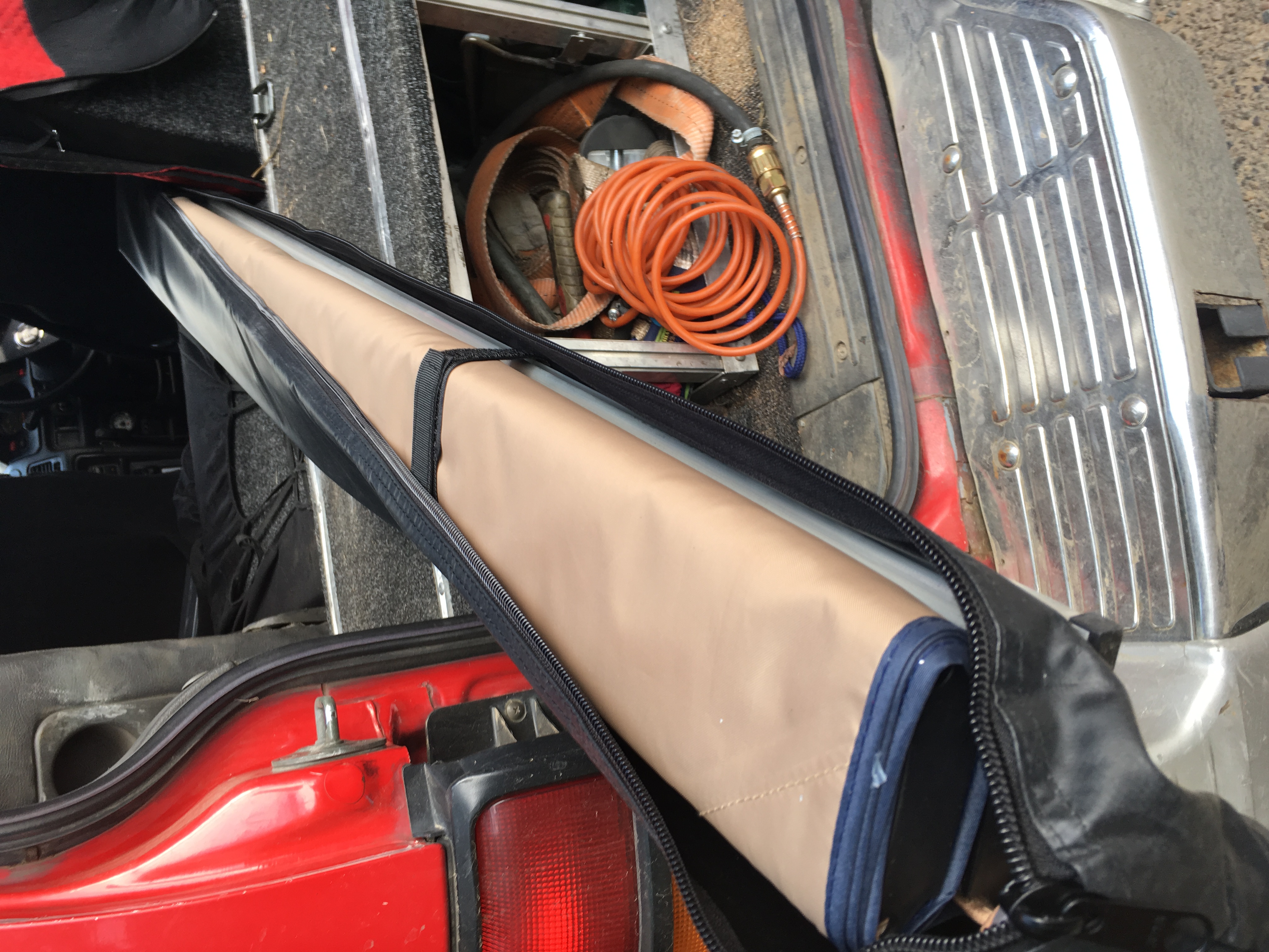 Тент ставится и снимается за считанные секунды, сворачивается в рулон вокруг трубки и убирается в багажник. Размещается вдоль спинки заднего сиденья и цепляется крюками к подголовникам. Если не хочется совсем мокрый тент класть в багажник, то его можно закрепить резинками вдоль рейлинга.