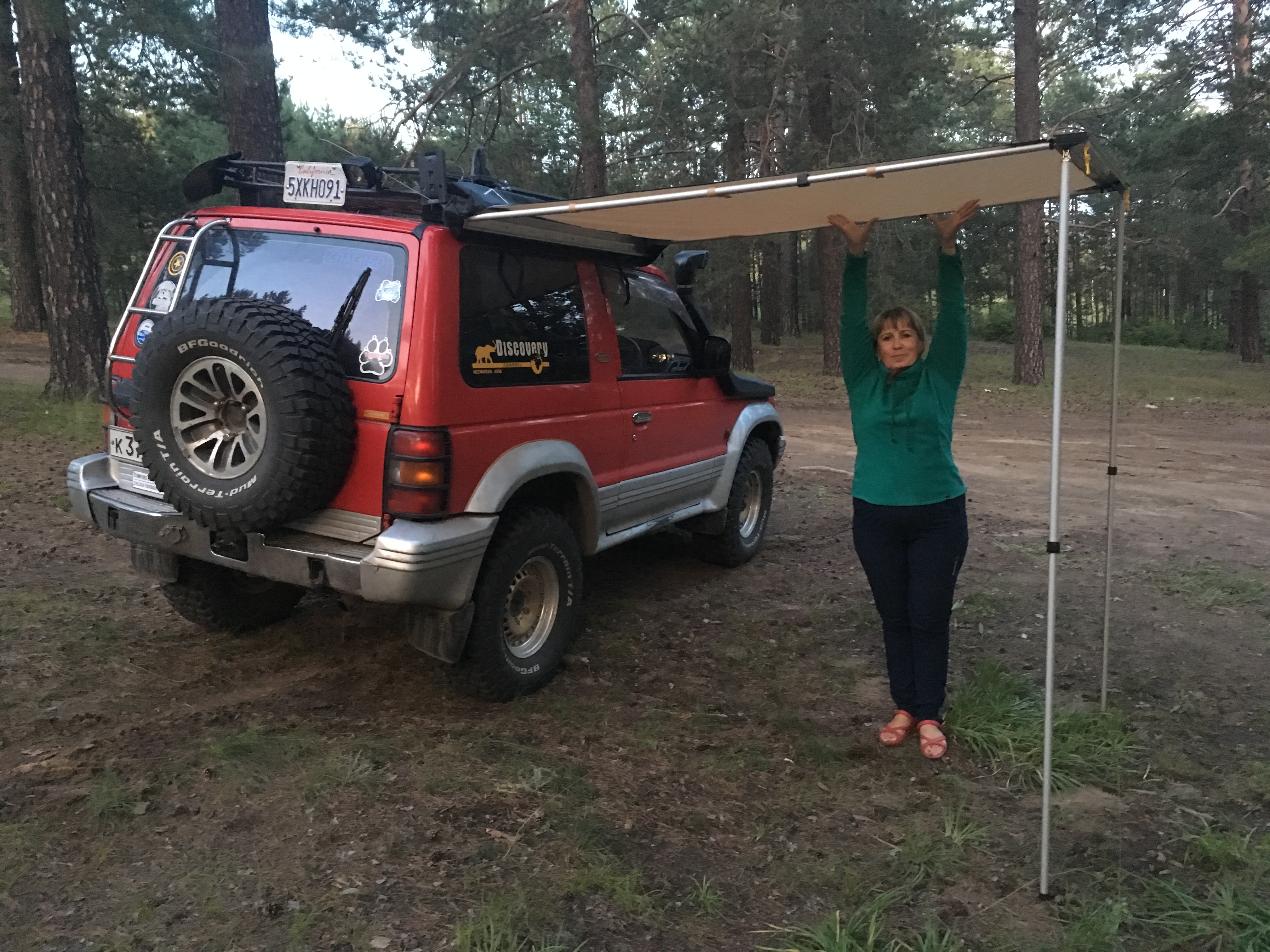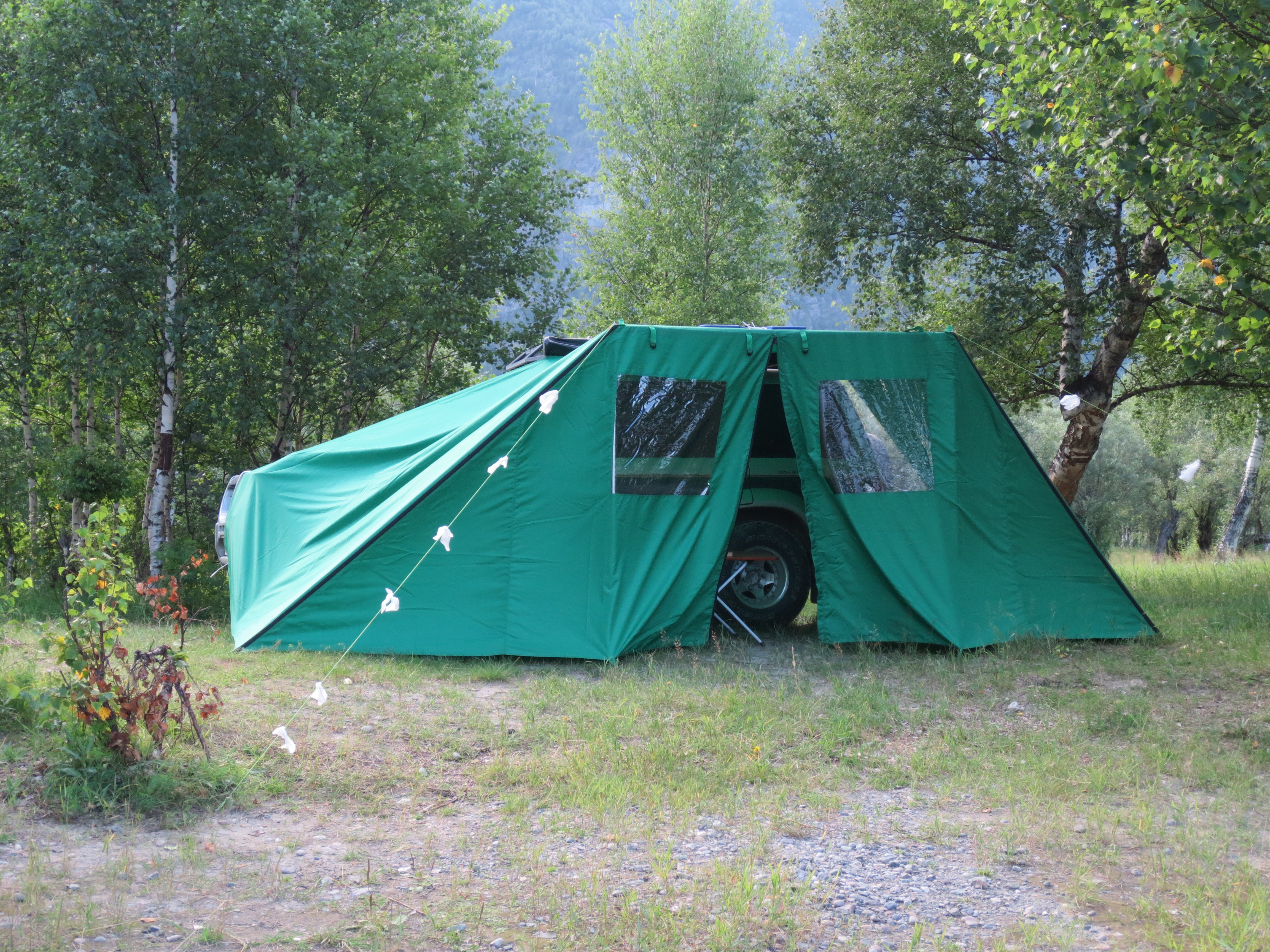 Сторона тента с трубкой кладётся поперёк рейлингов, резинки обводятся вокруг рейлингов и цепляются сами за себя. Угол тента с длинной резинкой натягивается на открытую дверь и цепляется за низ двери. Оставшийся угол тента с оттяжкой имеет несколько вариантов: остаётся висеть без крепления - достаточно для погрузки-разгрузки в дождь. Оттягивается оттяжкой за колышек или дерево И/ИЛИ подпирается разборной стойкой в землю или в бампер - получается нормальный навес для перекуса в дороге.