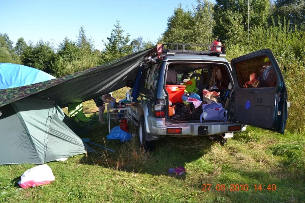 Также тент можно закрепить вдоль одного рейлинга, тогда он будет защищать от дождя две двери, это удобно при ночёвке в машине, чтобы залезать через дверь.