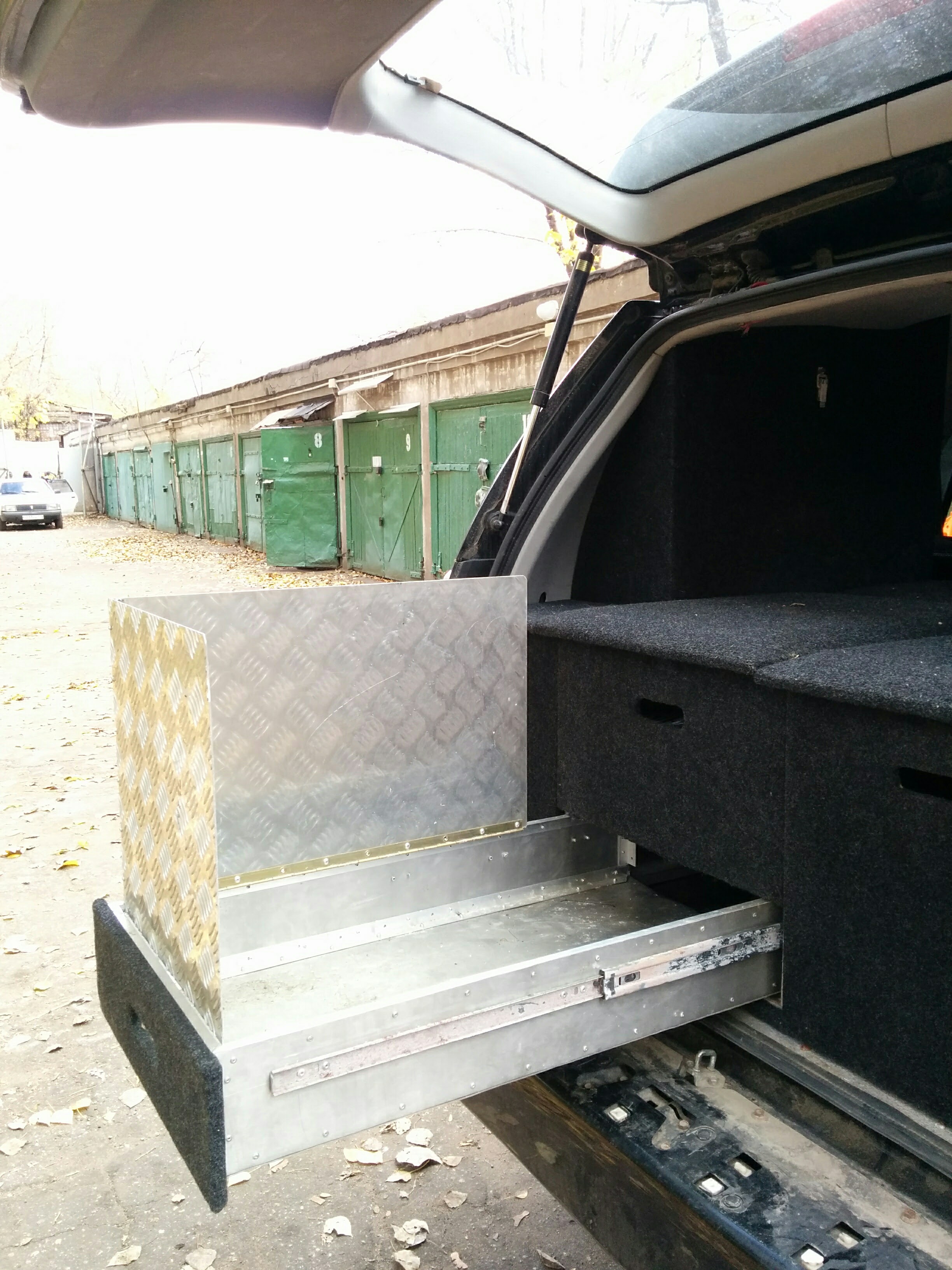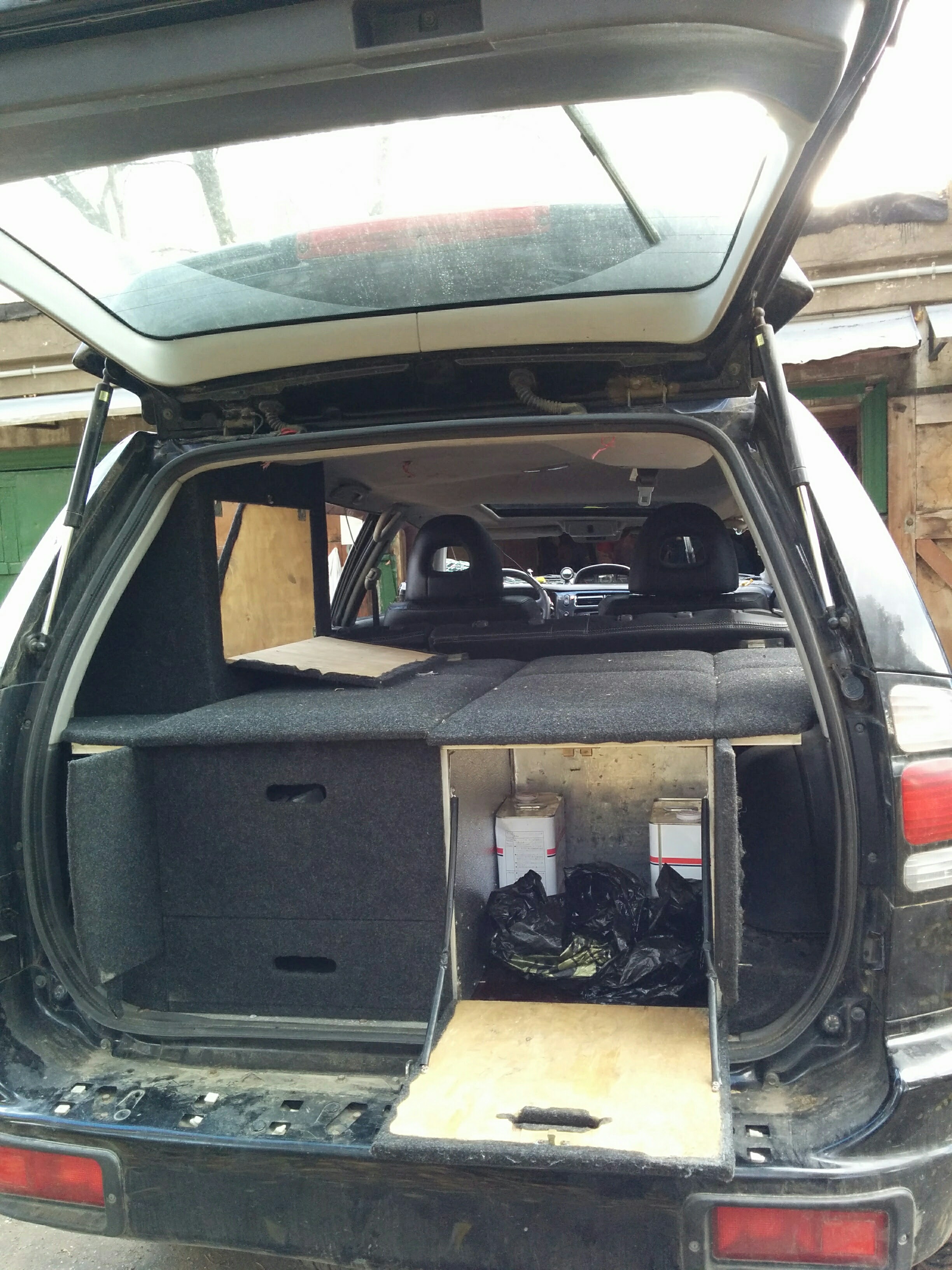 - Удобная система хранения в багажнике от Скитальца с местом для газовой плитки, хайджека и лежаком