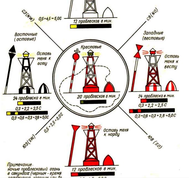 Это знаки ограждения навигационных опасностей на море и озере относительно стран света.
