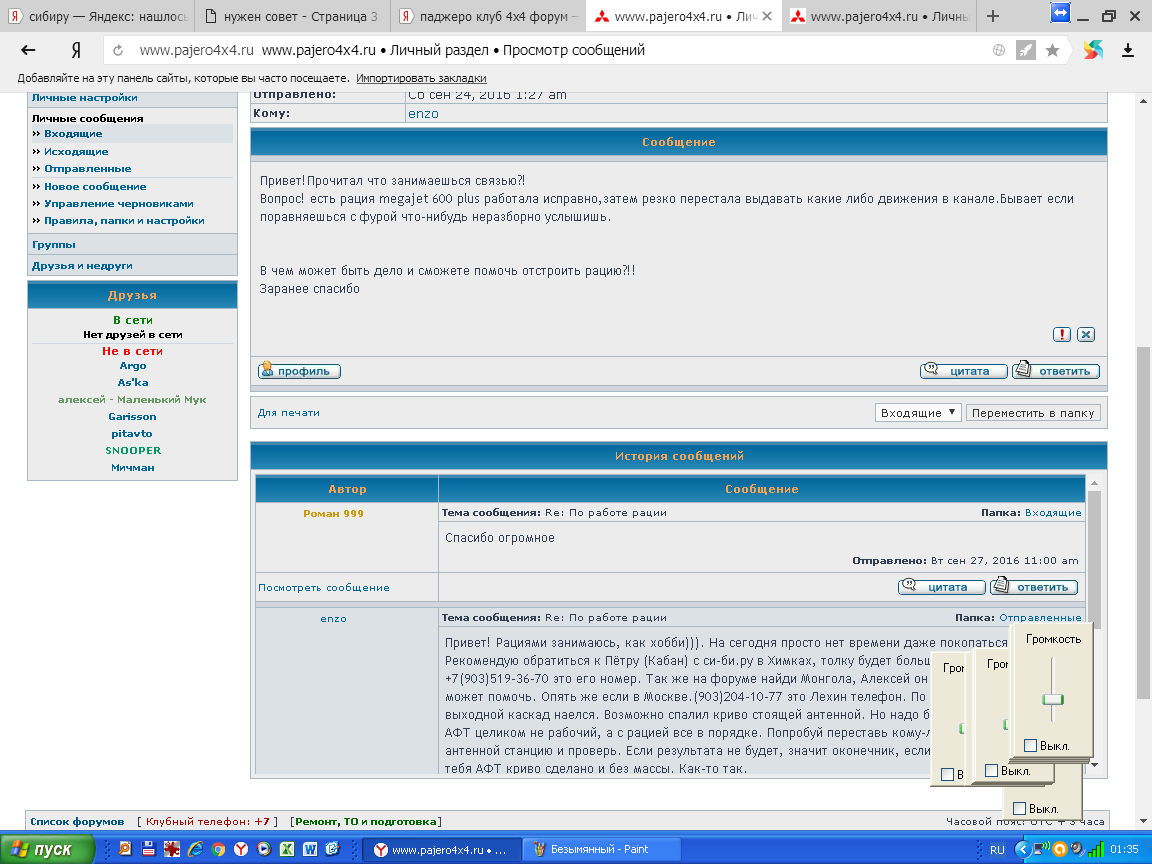 Есть контакты и Андрея и Кабана. Территориально Химки. Надо? В личку скину.Chumahod писал(а):Кабану постучись в личку, либо Андрей (ака Воробей, если мне память не изменяет). Мою радейку Кабан при мне дорабатывал/шаманил. С 2010-го года = полёт нормальный!Роман 999 писал(а):А может тогда есть конкретный чел там,кто занимается ремонтом????Телефончик его и даже заходить туда не буду!Дабы не травмировать людям психику)))))Я этих заумных,чересчур правильных не люблю!Глаз левый дергатся начинает))))))