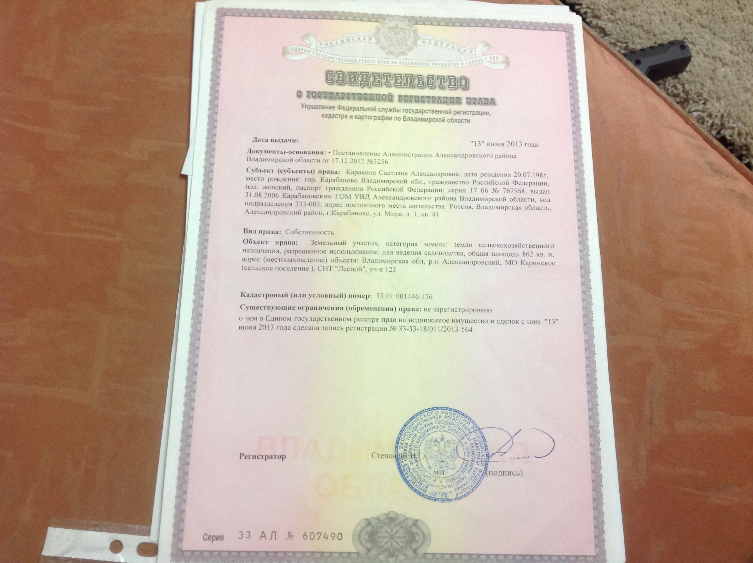Участок оформлен на жену. Александровский р-н, д. Степково 2 км от города Карабаново.