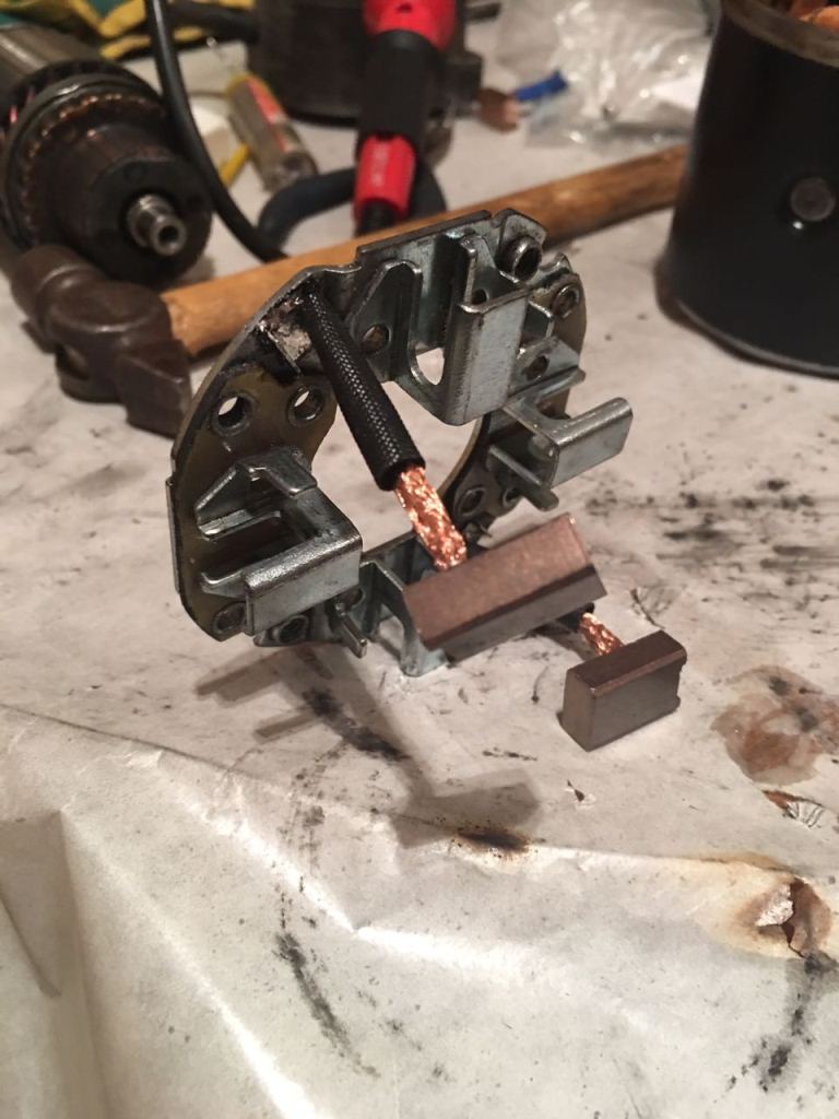 Щеткодержатель и редуктор в отличном состоянии.Смазал задний подшипник ишестерни. Новые щетки приварил инверторным сварочником с помощью старой щетки в качестве электрода. Ток 40-50А.