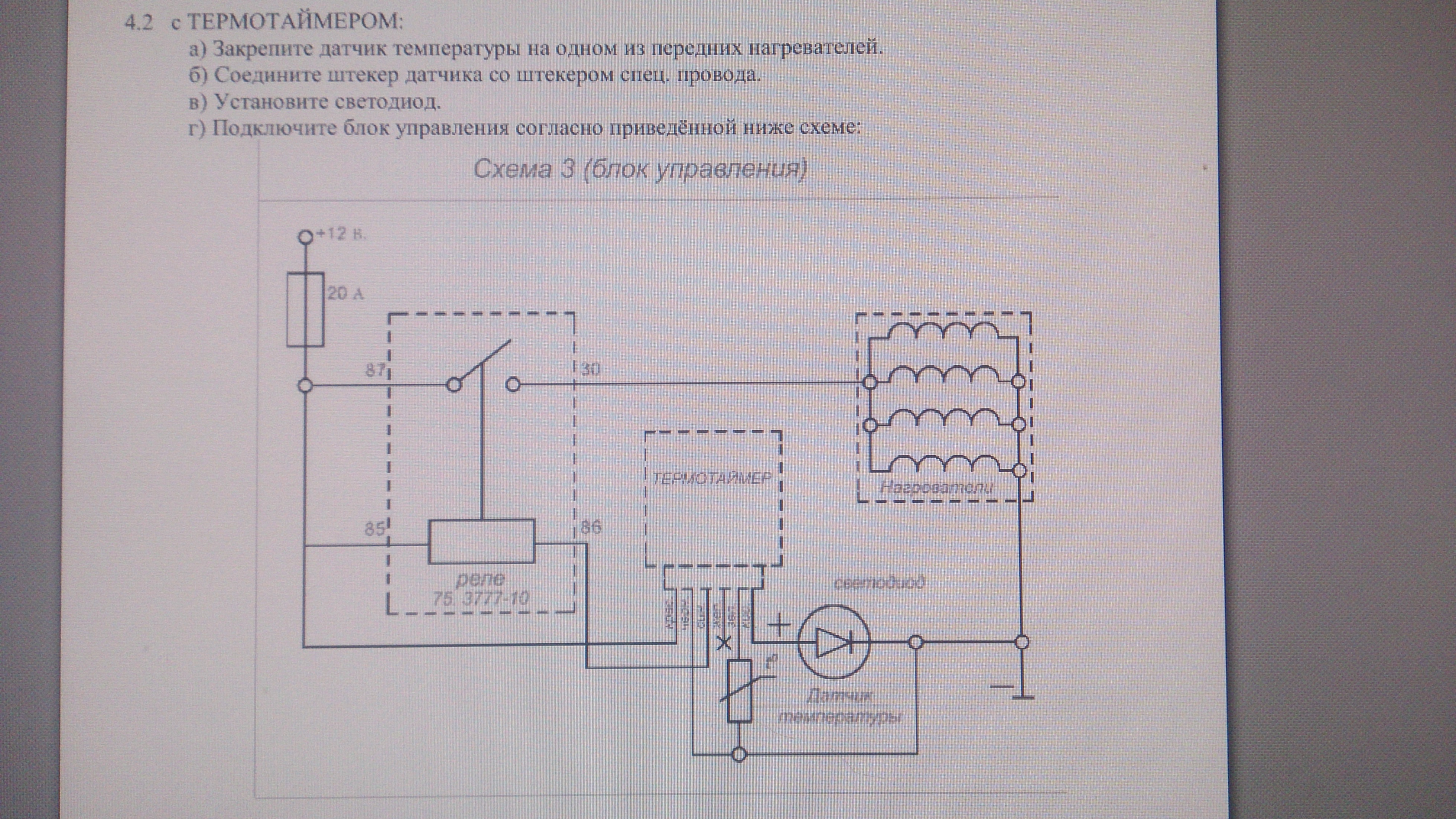 Тебе нужно смотреть вторую схему, которая с термотаймером. В 1 пункте зачем содиняешь с чёрным? С красным же в схеме? Пункты 2,3,4 все правильно. Кнопку выключения лучше поставить в разрыв 85 линии. При этом ты отключаешь реле. Провод идущий из нагревателя это датчик. Его надо включить на зелёный провод термотаймера. Чёрный провод с термотаймера надо включить на массу. Диод одним концом надо включить на коричневый провод термотаймера, а второй на массу. Диод имеет полярность. Если там есть черный провод - его на массу. Если непонятно ... Сможешь подключить его на любую батарейку 1,5В? Подключи его кратковременно к батарейке. Если буде светить - тот вывод, который на плюсе на коричневый провод, а минус на массу. Если гореть не будет - поменяй полярность. Будут вопросы - пиши!