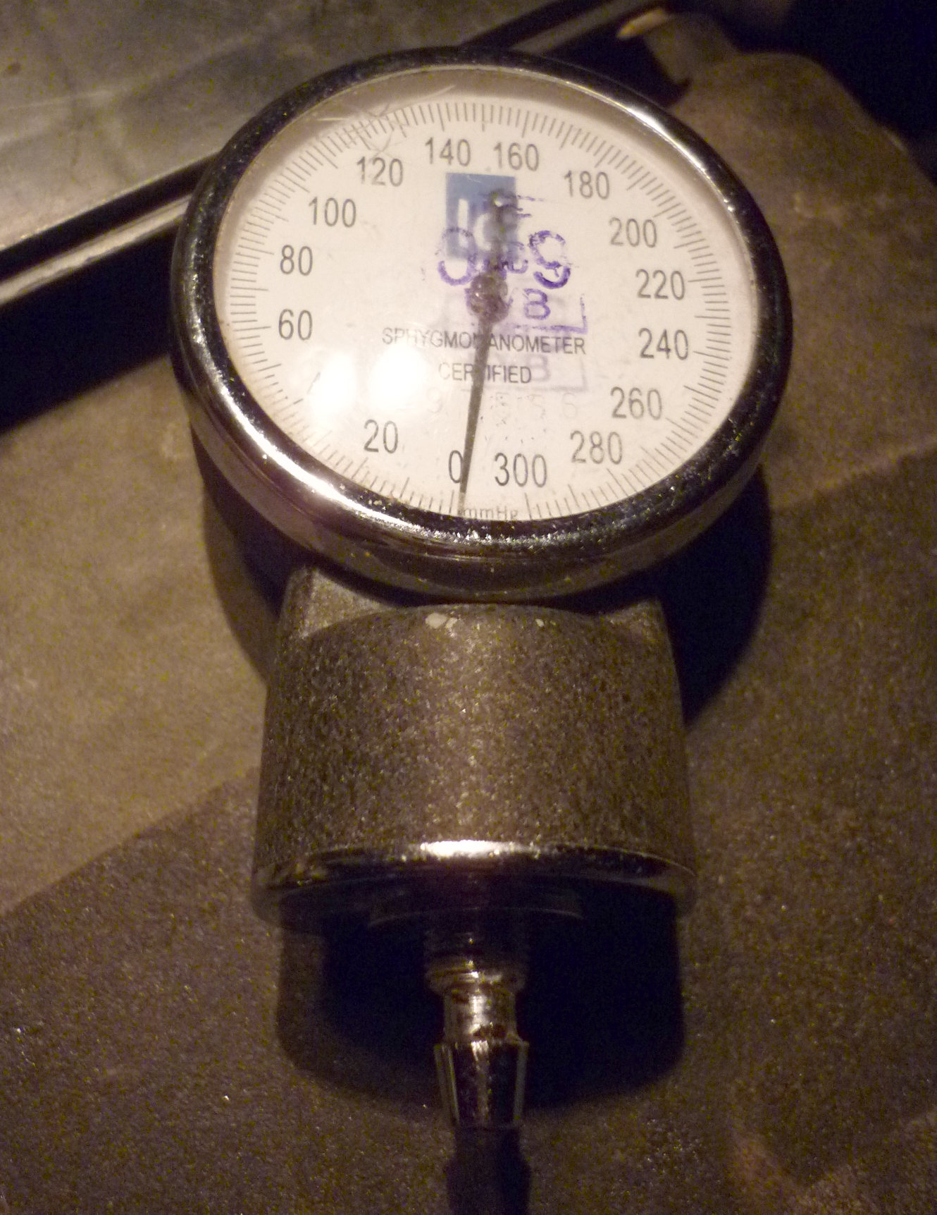Указанный манометр оказался грубоват для такой работы, т.е. он тупо показывал ноль без шевелений. Но в гаражном арсенале у меня есть более чувствительный - от медицинского тонометра, т.е. измерителя артериального давления. Правда он без средней точки, но у него ход стрелки вниз не ограничен отбойником, что оказалось весьма кстати... Обращаем внимание на фото, что манометр не подцеплен, и стрелка немного не на нуле, а сбита примерно на одно деление ниже.