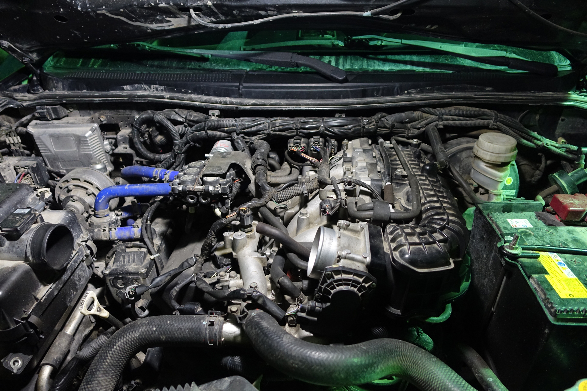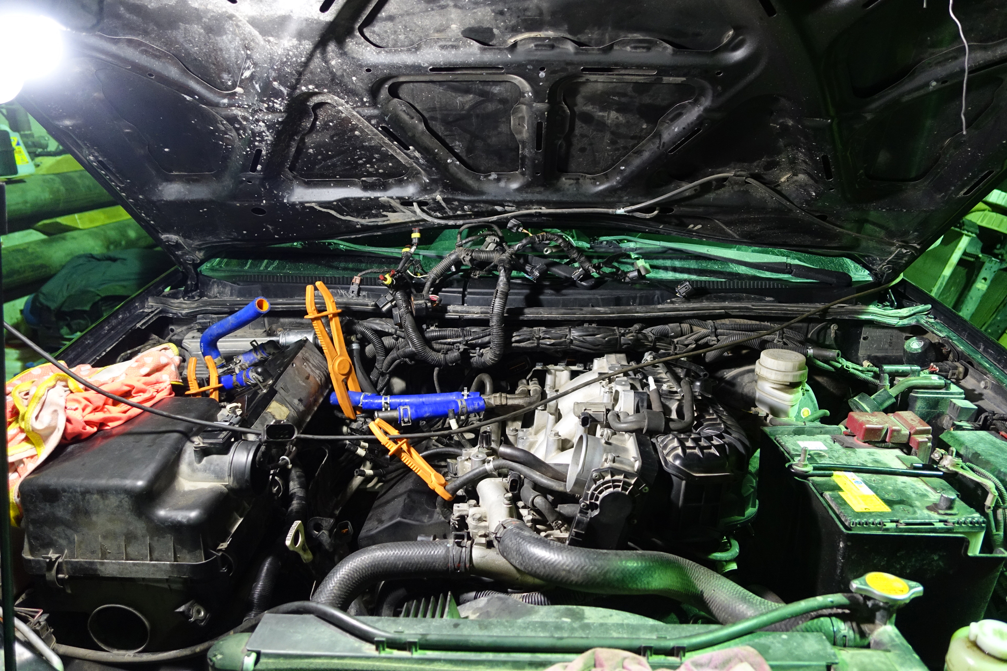 Снимаем гофру воздухана. Отсоединяю тосольные шланги к печке (там у меня гидронк стоит, все приходится снимать), отключаю проводку и катушки первого банка, убираю все под капот, дабы не мешалось. Перепутать фишки невозможно,везде защита от дурака, не потеряйте металлическую скобу от разъема с моторчика заслонок воздушного коллектора, ее удобней снимать длинным медицинским зажимом. Снимаем дроссельную заслонку. Если надо помыть отключаем от дросселя еще два тосольных шланга. Снимаем коллектор - 2 гайки со шпилек на 12, ближняя снимается без проблем, дальняя или рожковым ключом на 12 (надо подлезть под тосольный патрубок) или "пьяным", и основные болты, что бы снять самый дальний болт на коллекторе надо поднять немного вверх основную косу с проводами. Коллектор немного вверх что бы скинуть со шпилек и вправо, вынимаем. Отключаем на первом банке и снимаем катушки с обеих, снимаем клапанную крышку. Прокладки крепкие (не дубеют), можно не менять, у меня уже пережили 4 замену. Получаем доступ к клапанной группе.