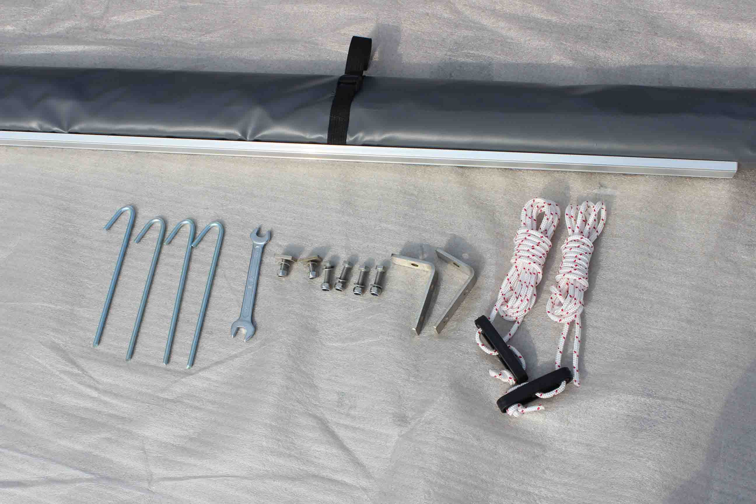 Тент можно крепить как угодно, хоть на экспедиционный багажник, хоть на рейлинги или поперечины. В комплекте примерно такой крепеж: