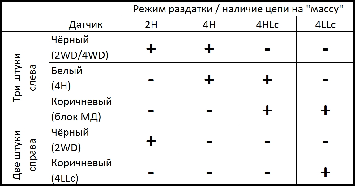 В смысле — раздатка в аварийный режим стала вываливаться. Как только морду отключаешь — или сразу, или через двести метров получите мигание лампочки блокировки межосевого дифференциала. Диагностика показала наличие всего одного кода неисправности: 33 (обрыв / кз / нестабильный сигнал датчика режима). Ладно, какой именно датчик дурит голову, можно будет выяснить при помощи простого тестера.